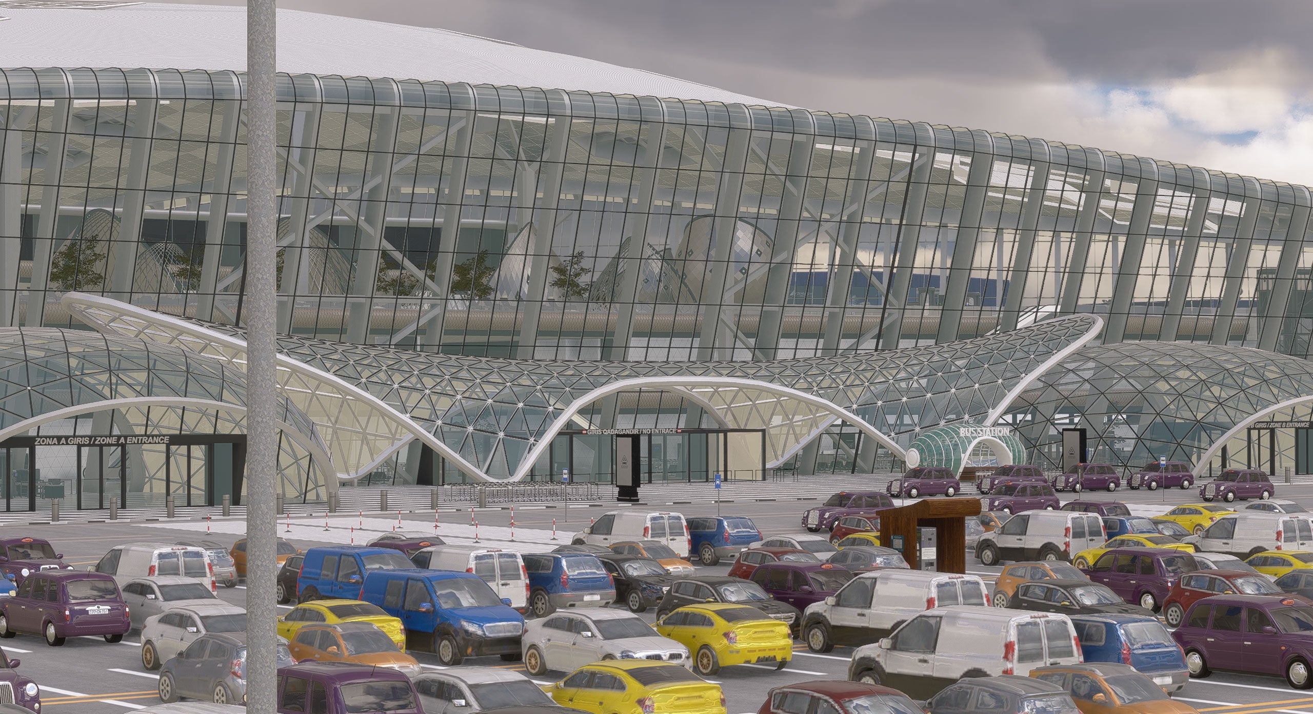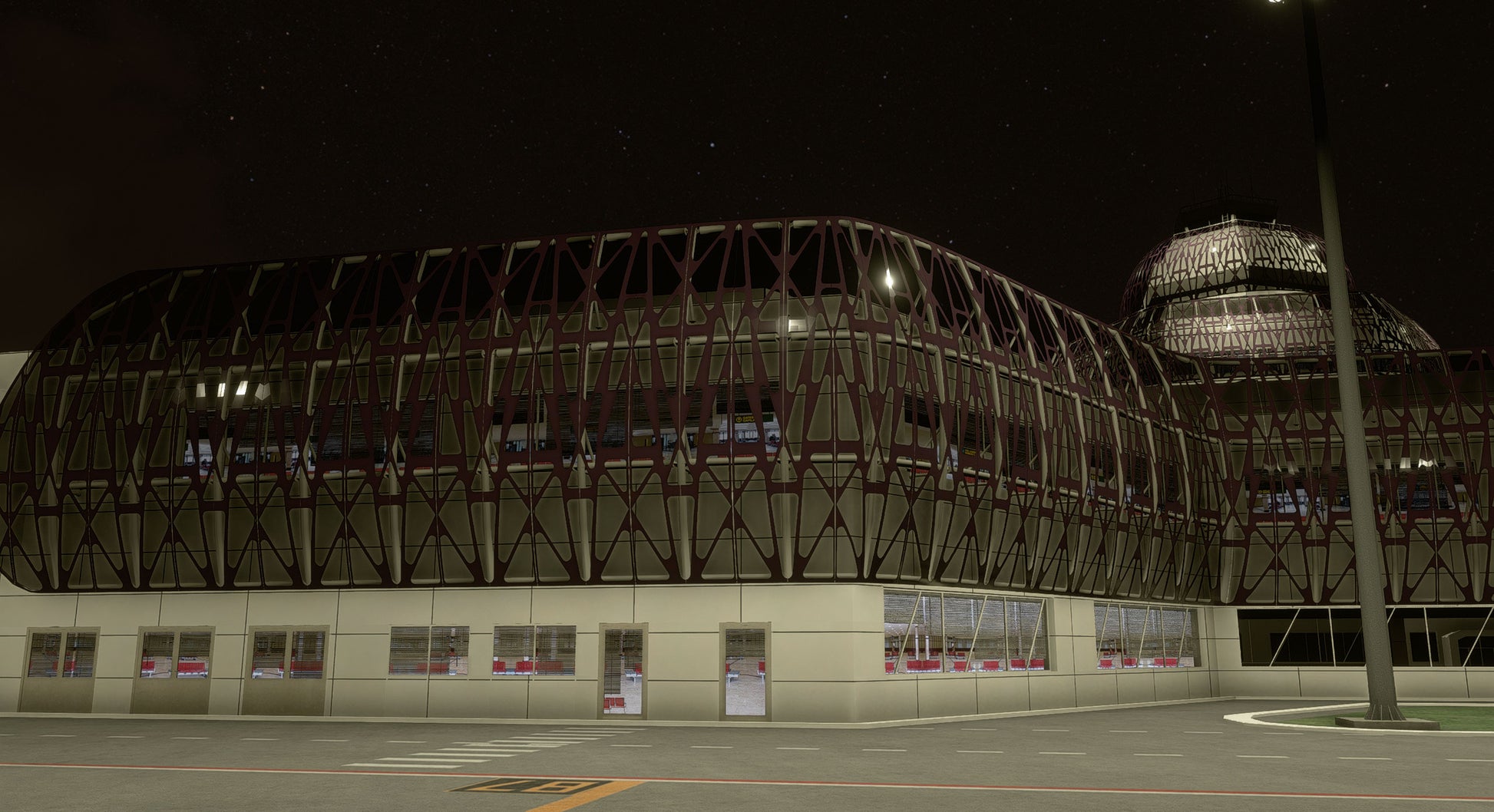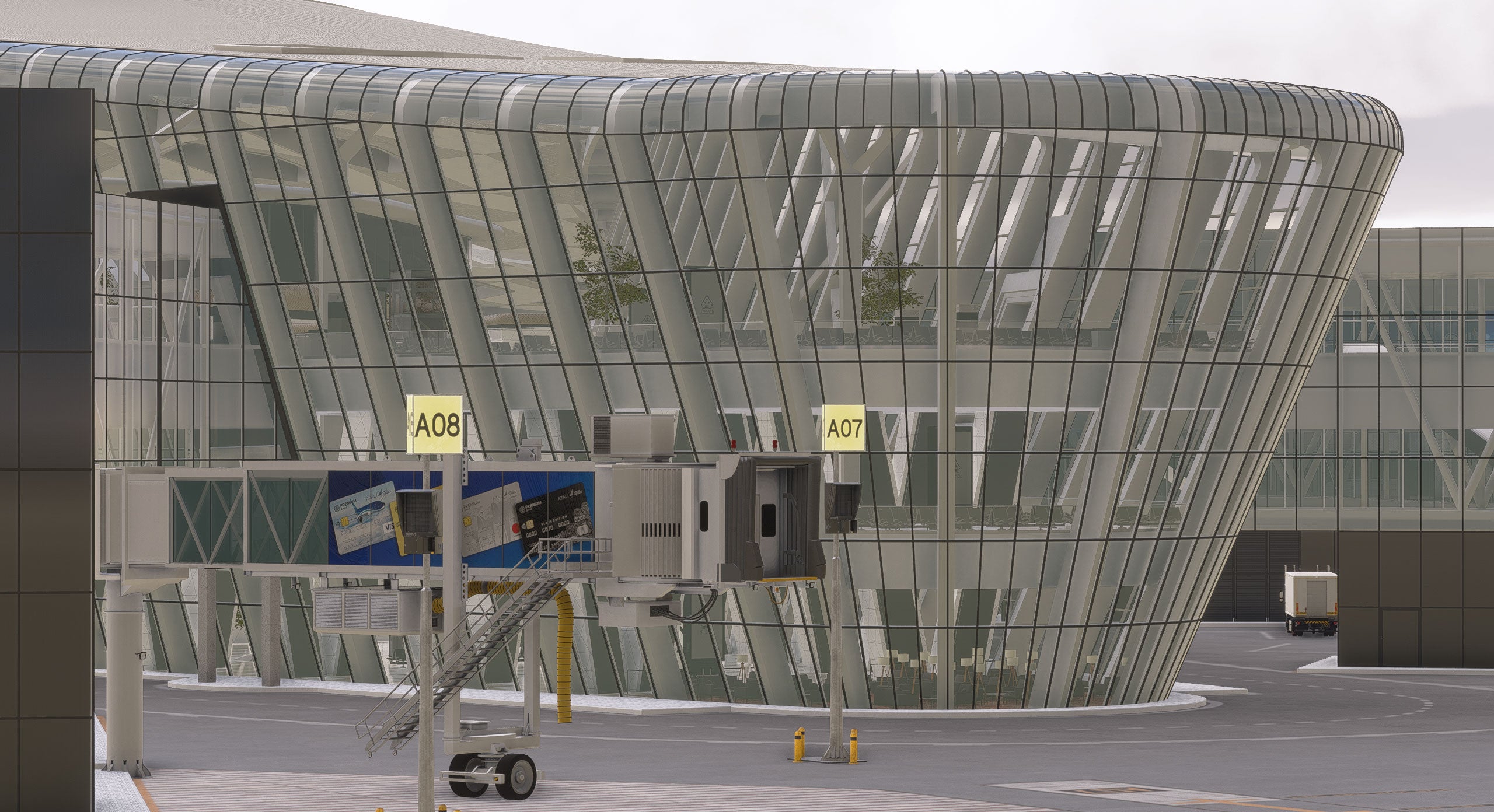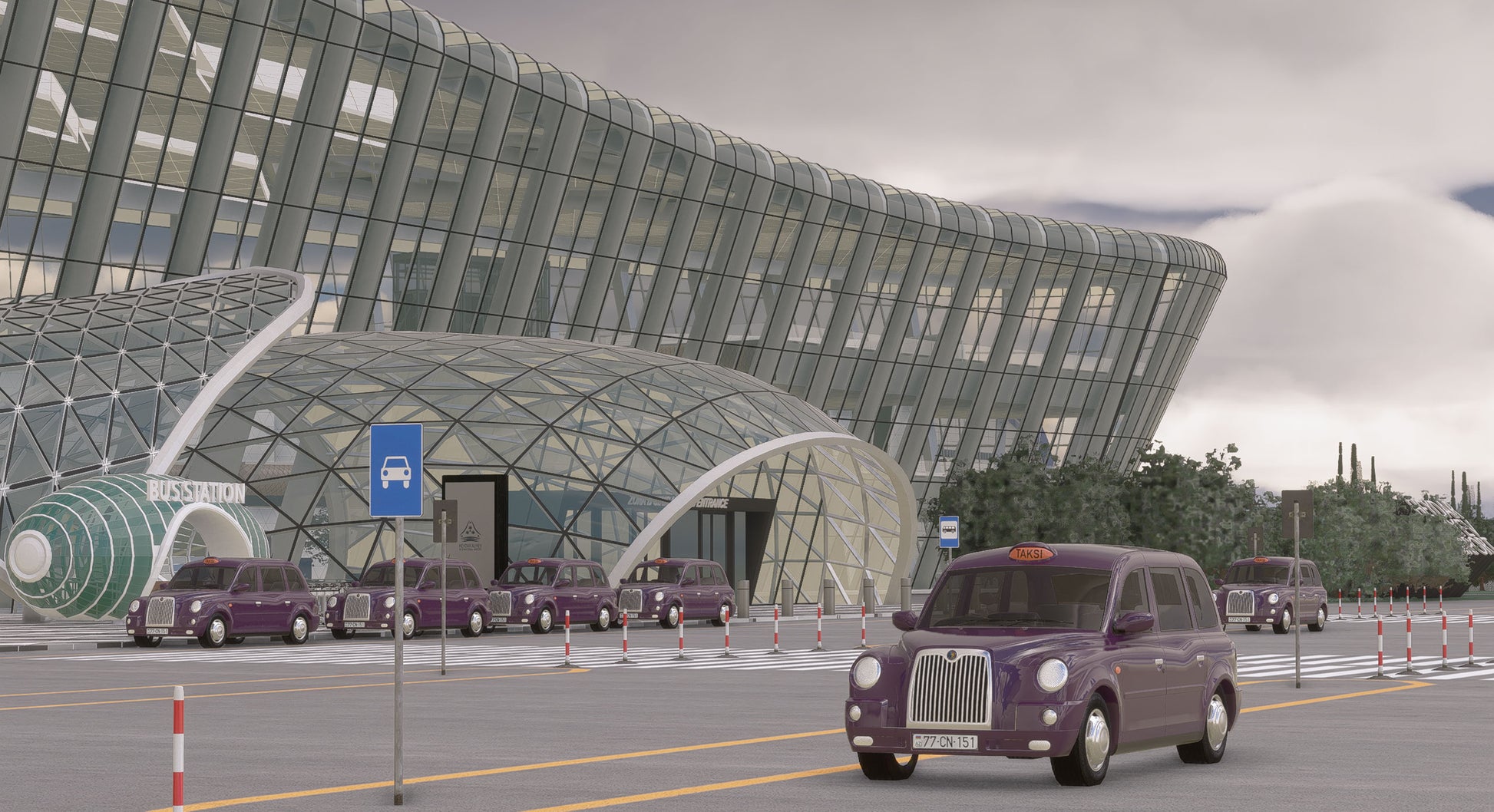 Attention to detail extends down to the smallest elements: custom-modeled Cobus shuttles, service vehicles, and ground props populate the airport, creating an authentic operational atmosphere. Every building, structure, and asset has been designed to replicate the unique architectural character of Heydar Aliyev International.