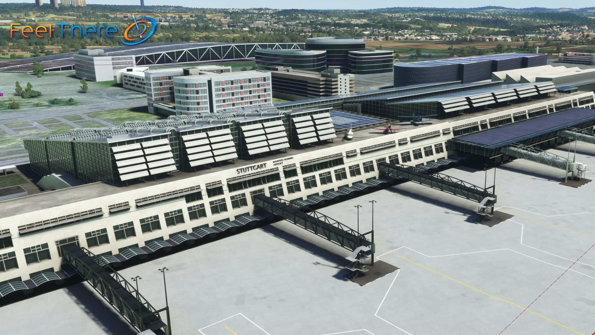 The airport has four terminals, from west to east: T1, T2, T3 and T4. Terminal 4 will be rebuilt in the coming years. It is located on a 400 hectares land, of which about 190 hectares are green space. STR Airport was named after the former mayor of Stuttgart Manfred Rommel.