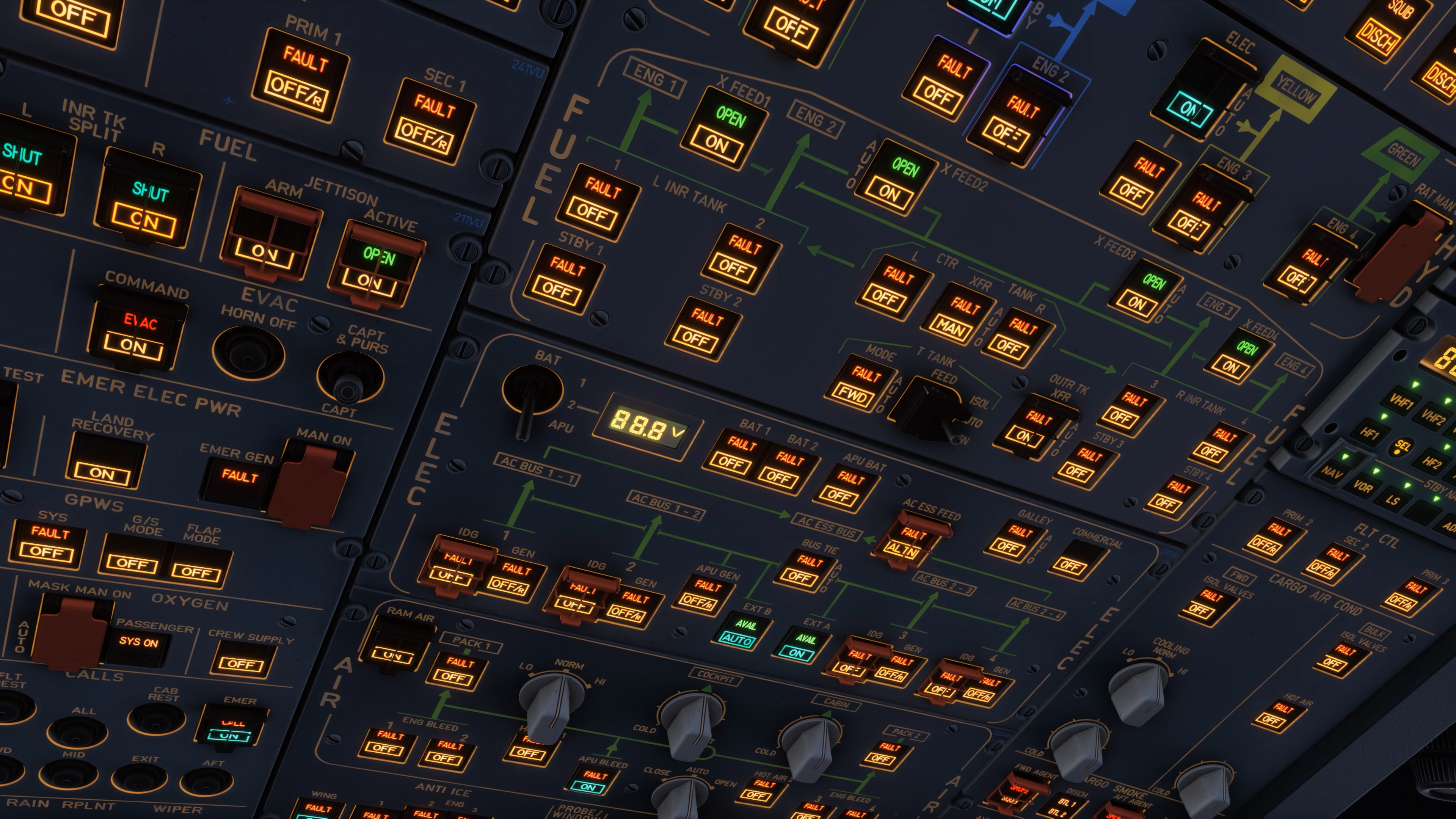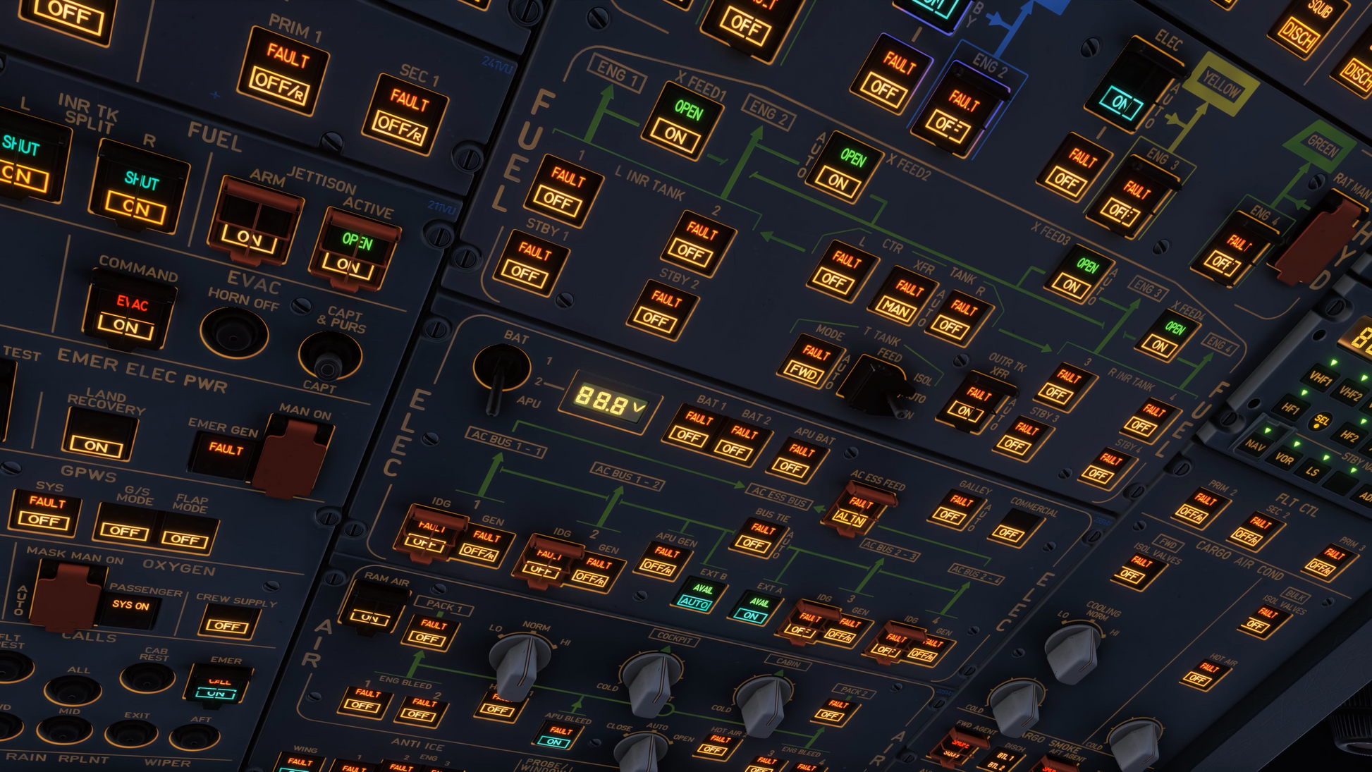 - ECAM & Failures: Over 100 fully modeled ECAM pages covering major ATA chapters, with dynamic custom failures such as bird strikes and GPS jamming for authentic system degradation and training scenarios.