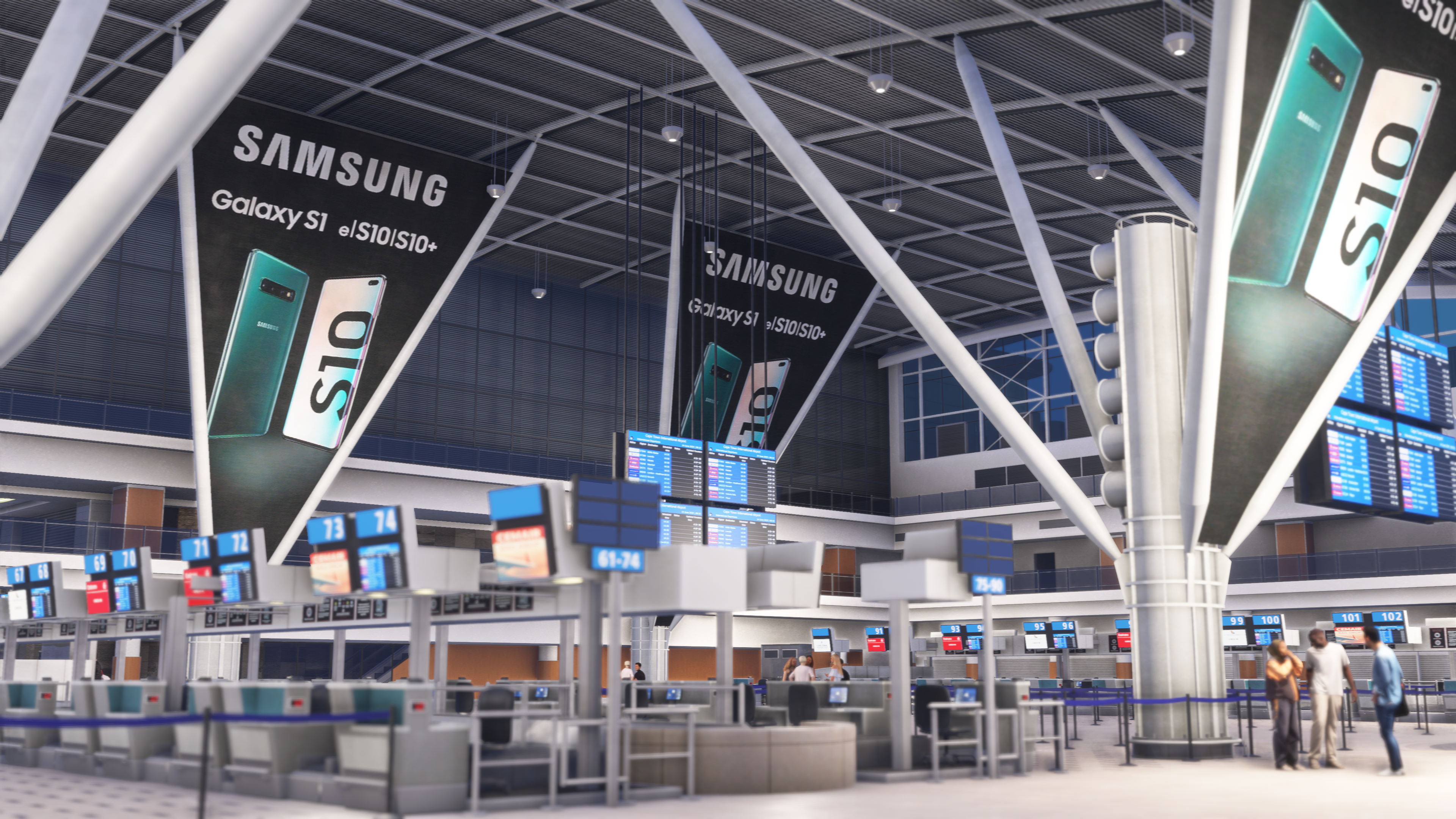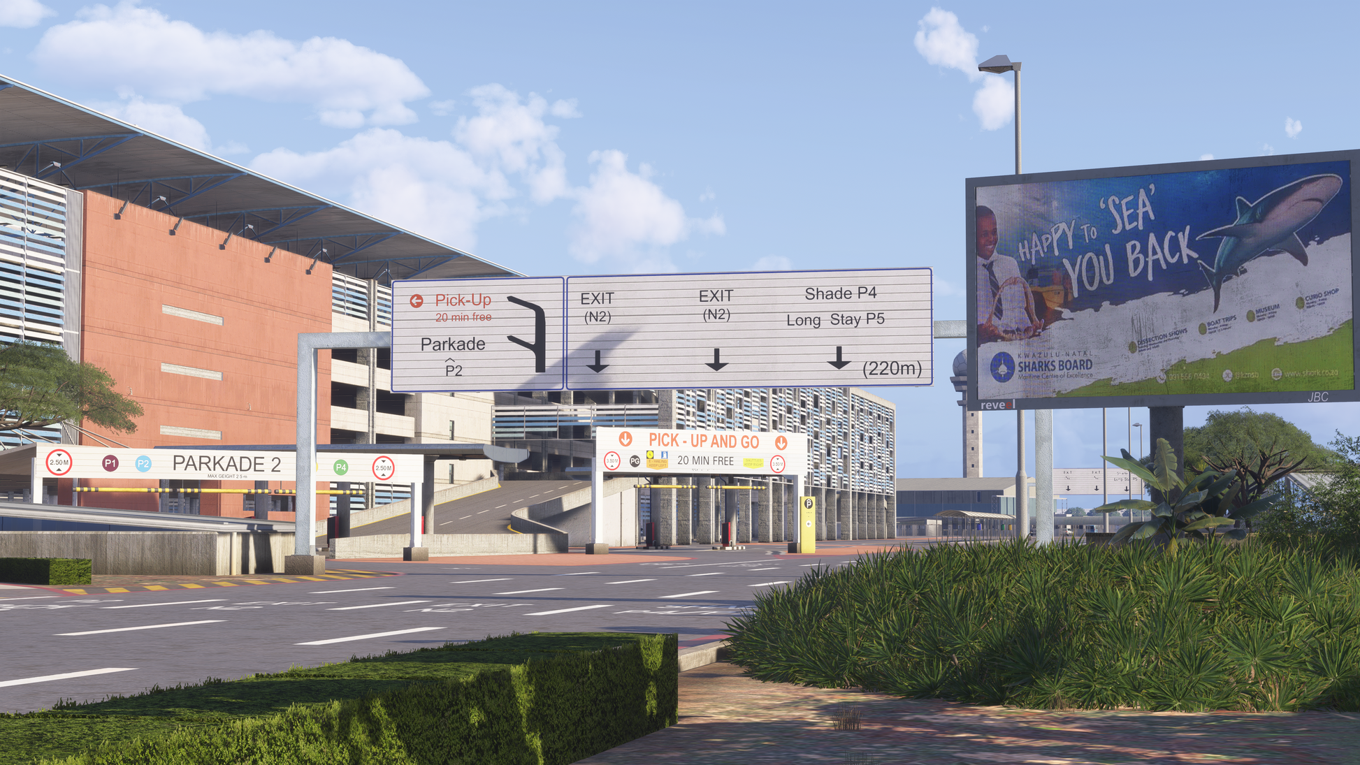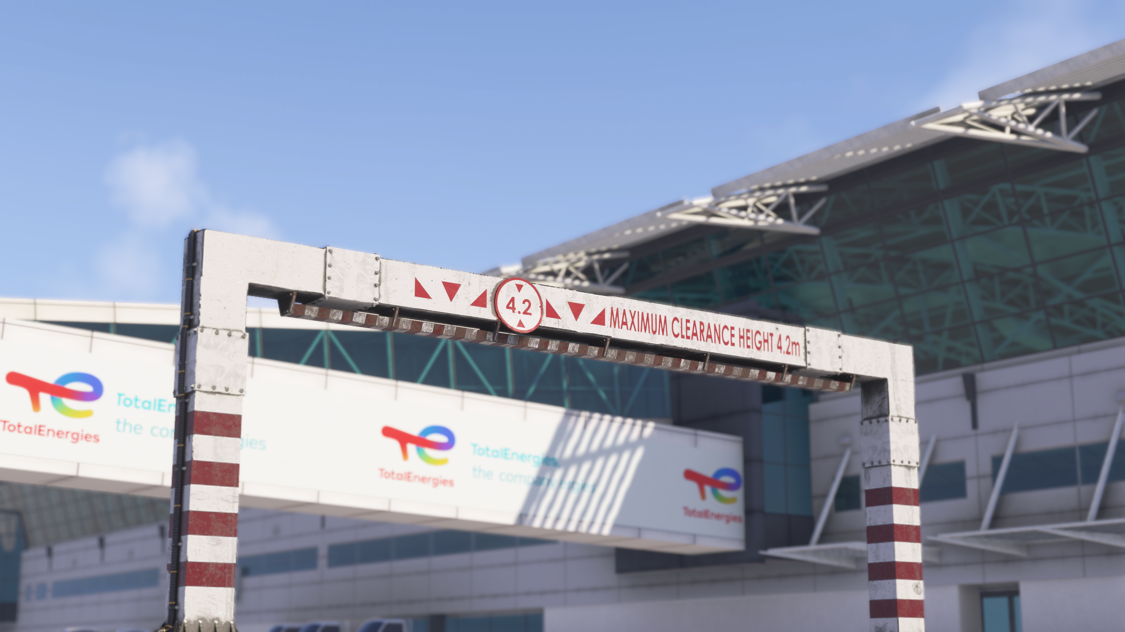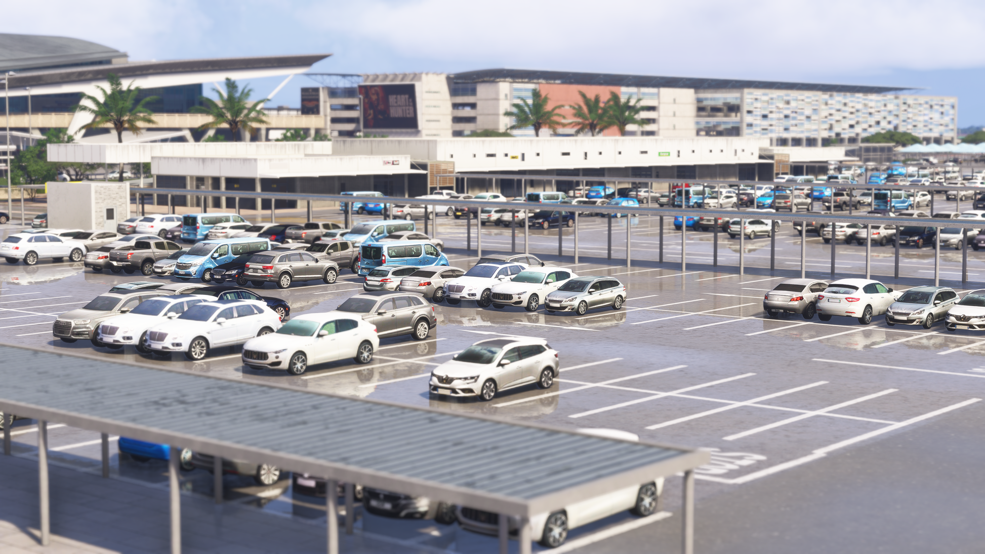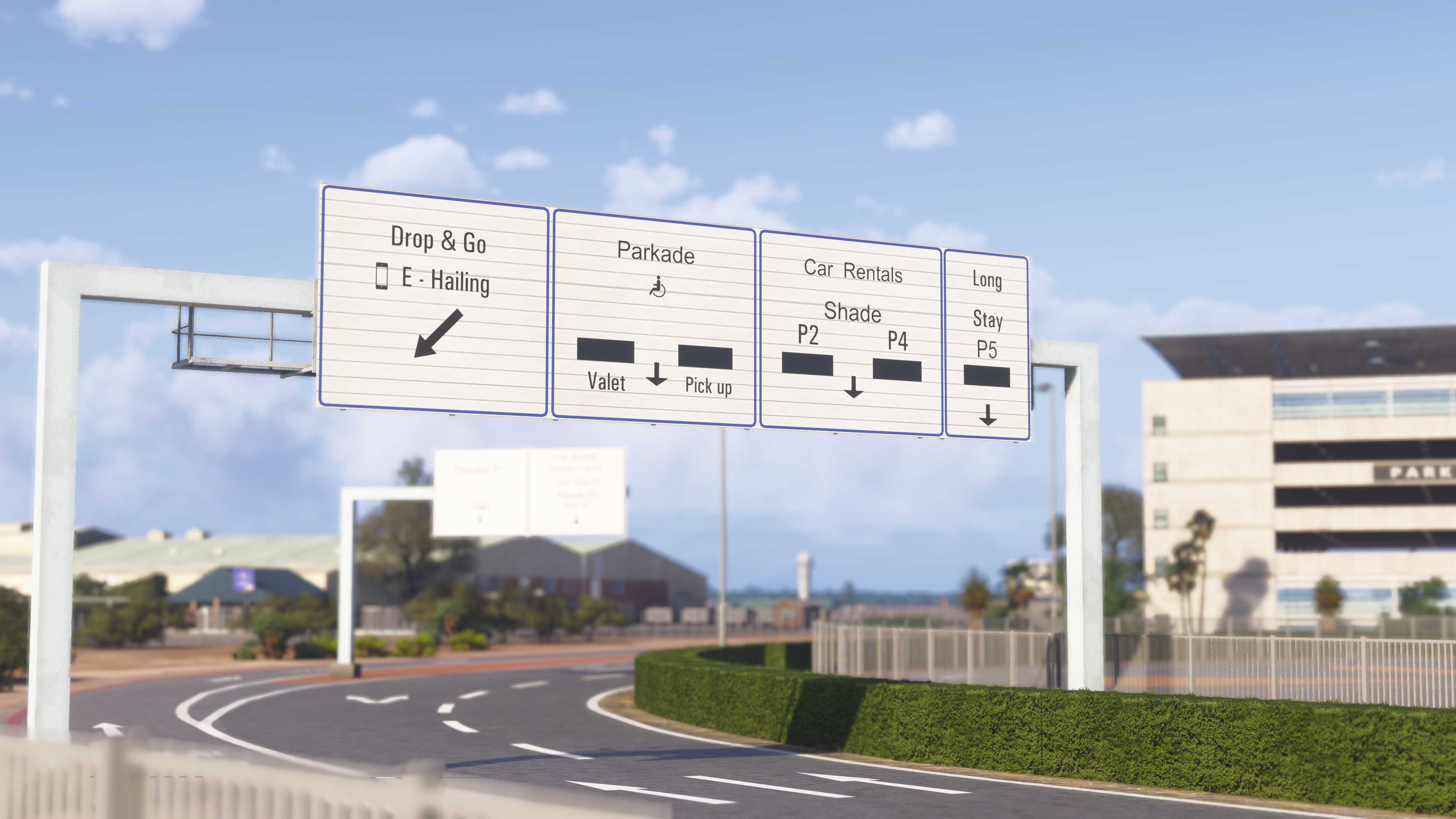 - True-to-life airport landside recreation with custom ground decals, signposts, vegetation, parking barriers, and more