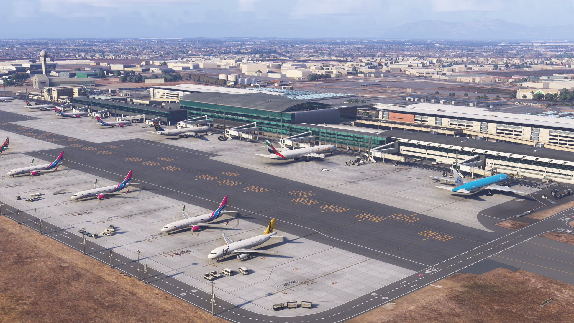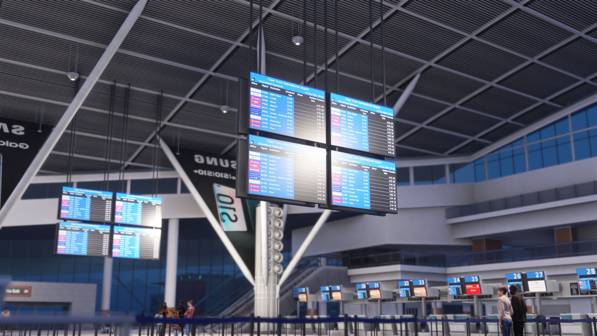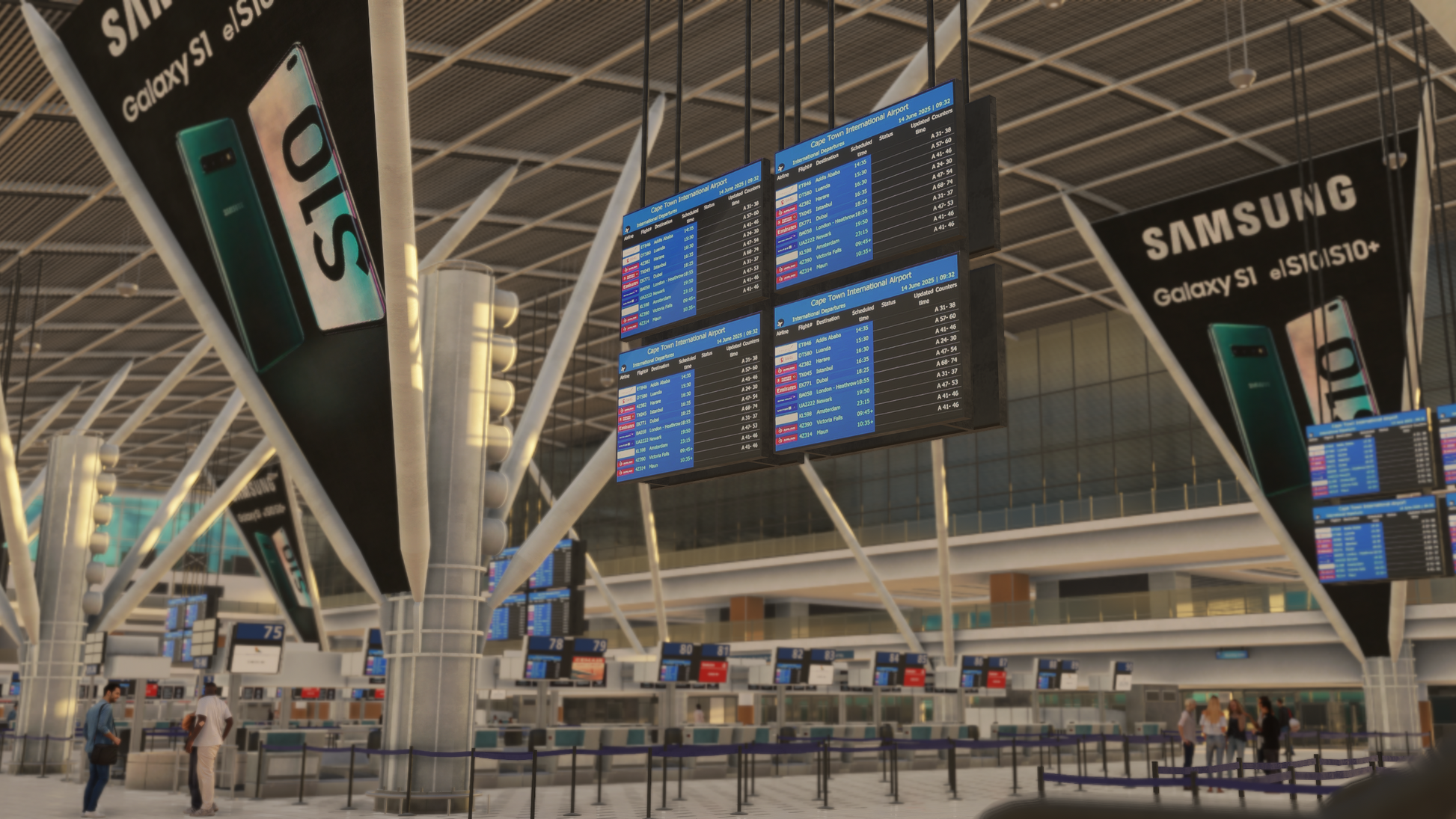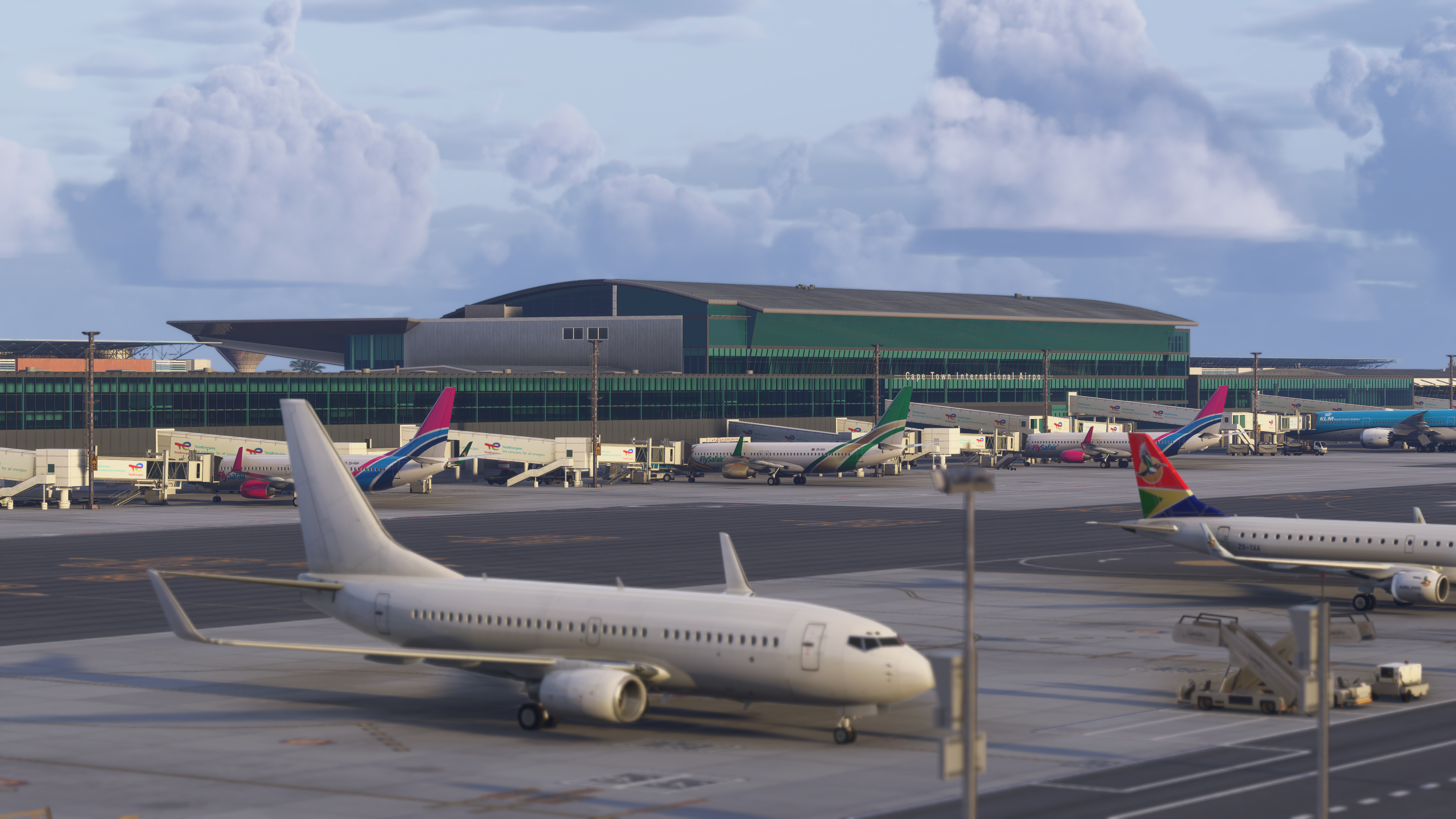 As South Africa’s second-busiest airport and the gateway to the Cape, CPT offers a diverse mix of long-haul international flights, regional services, and bustling domestic routes. This scenery includes accurately modeled terminals, precise taxiways, realistic signage, and custom ground service equipment to bring the airport to life.