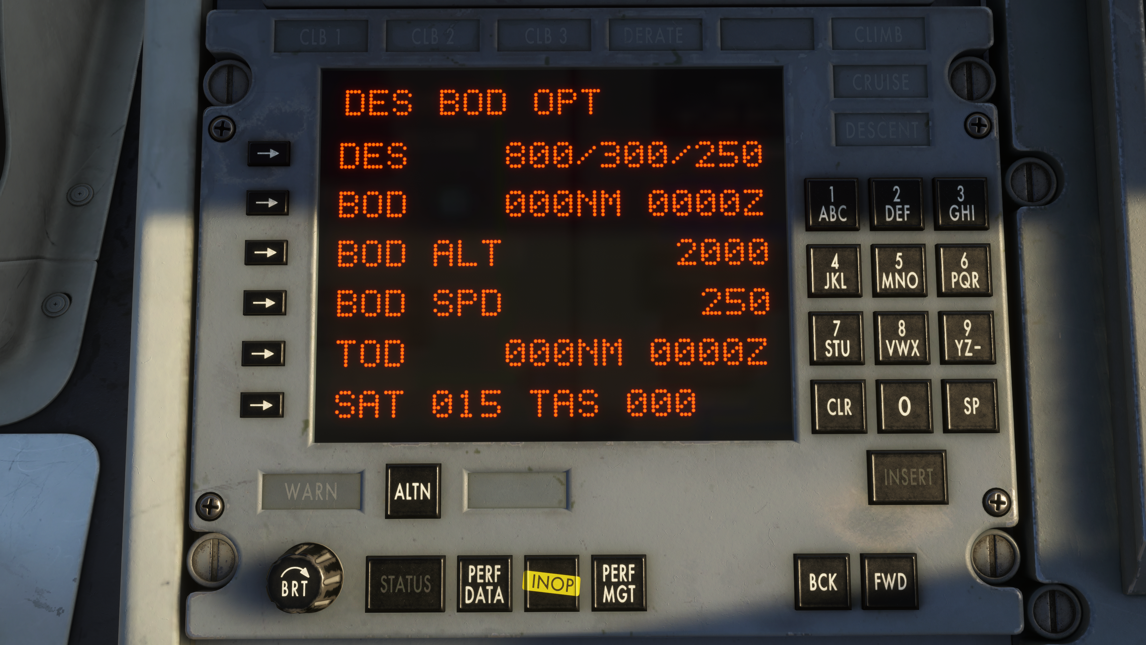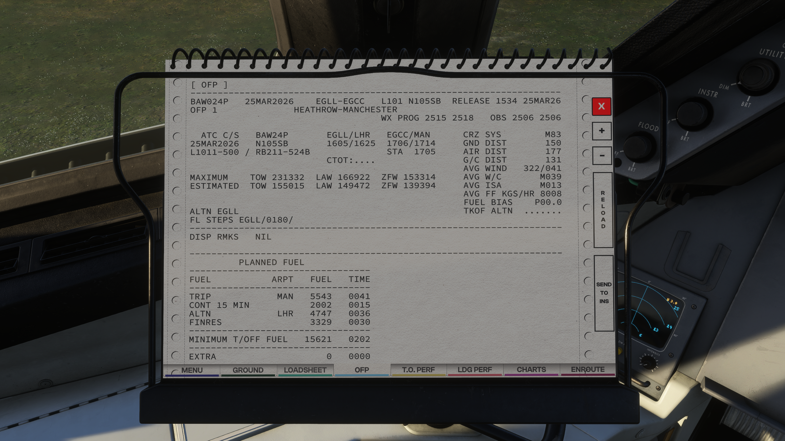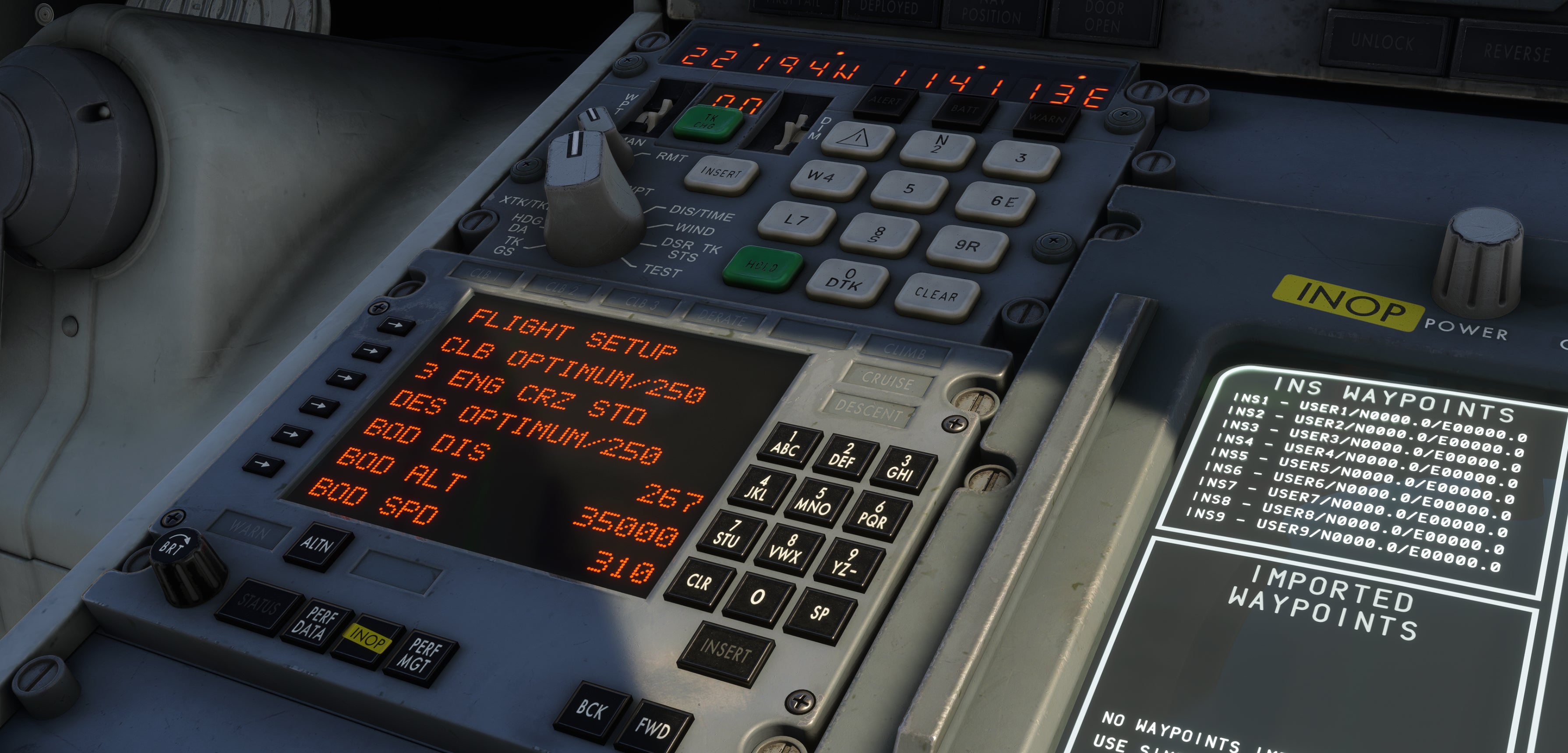 - Realistic INS behaviour and drift modelling, with aircraft position based on alignment accuracy and in-flight updates.