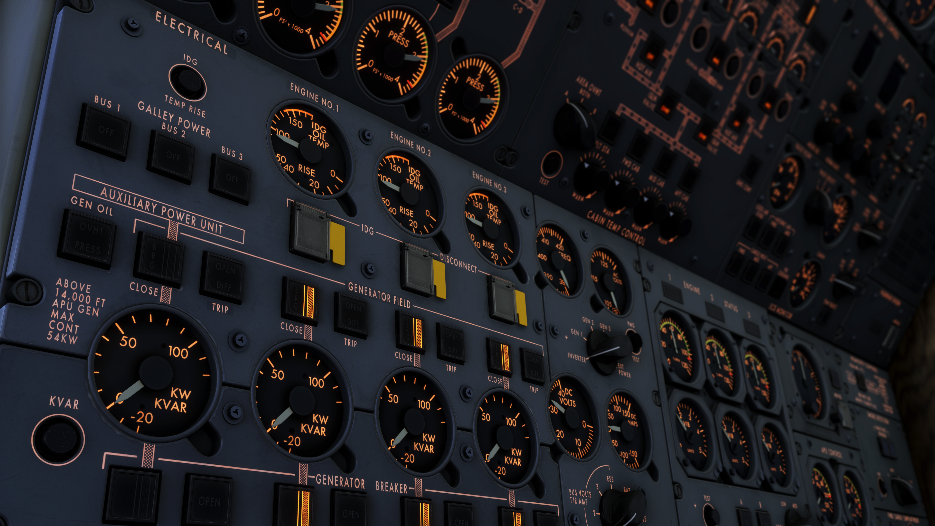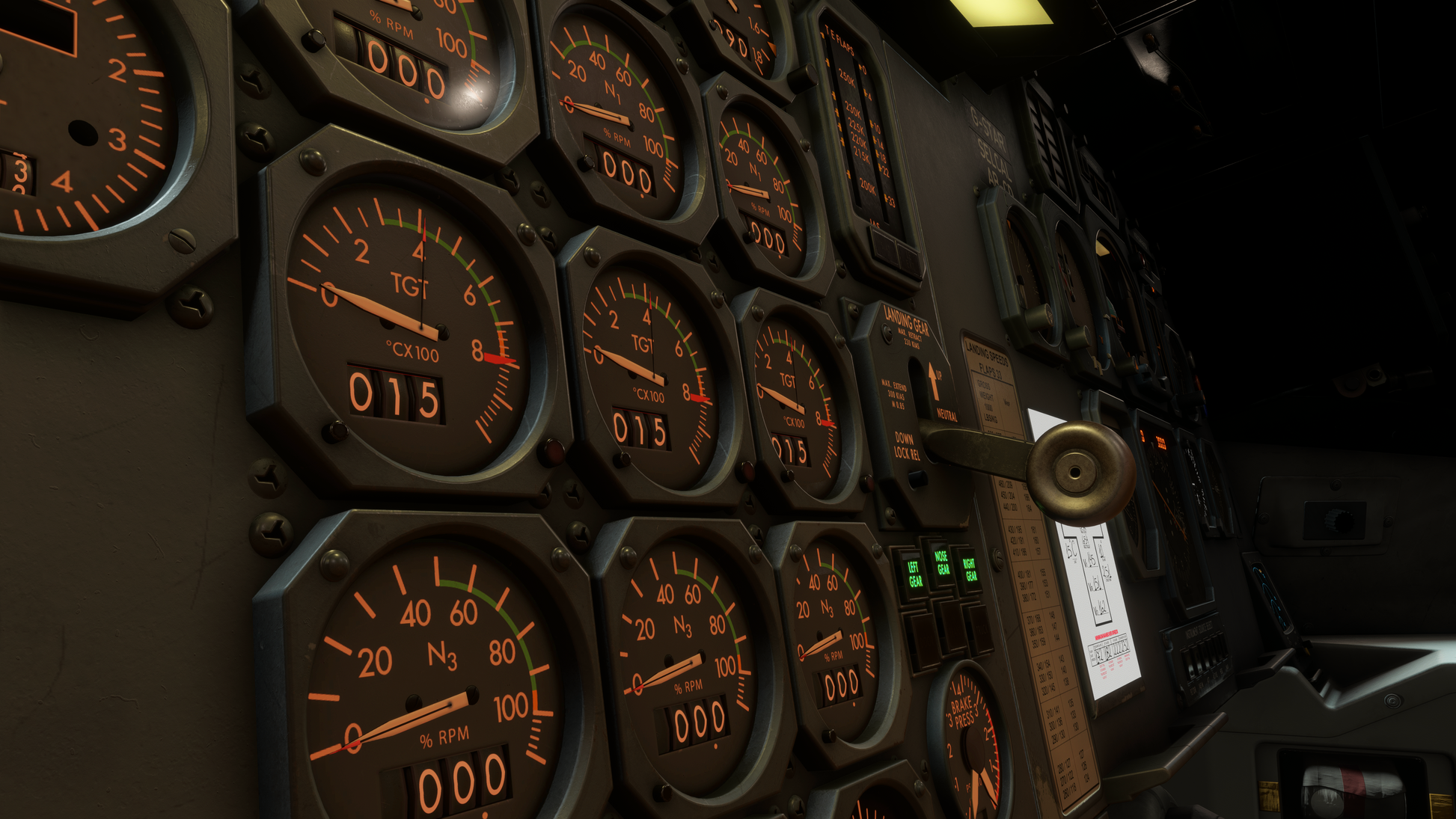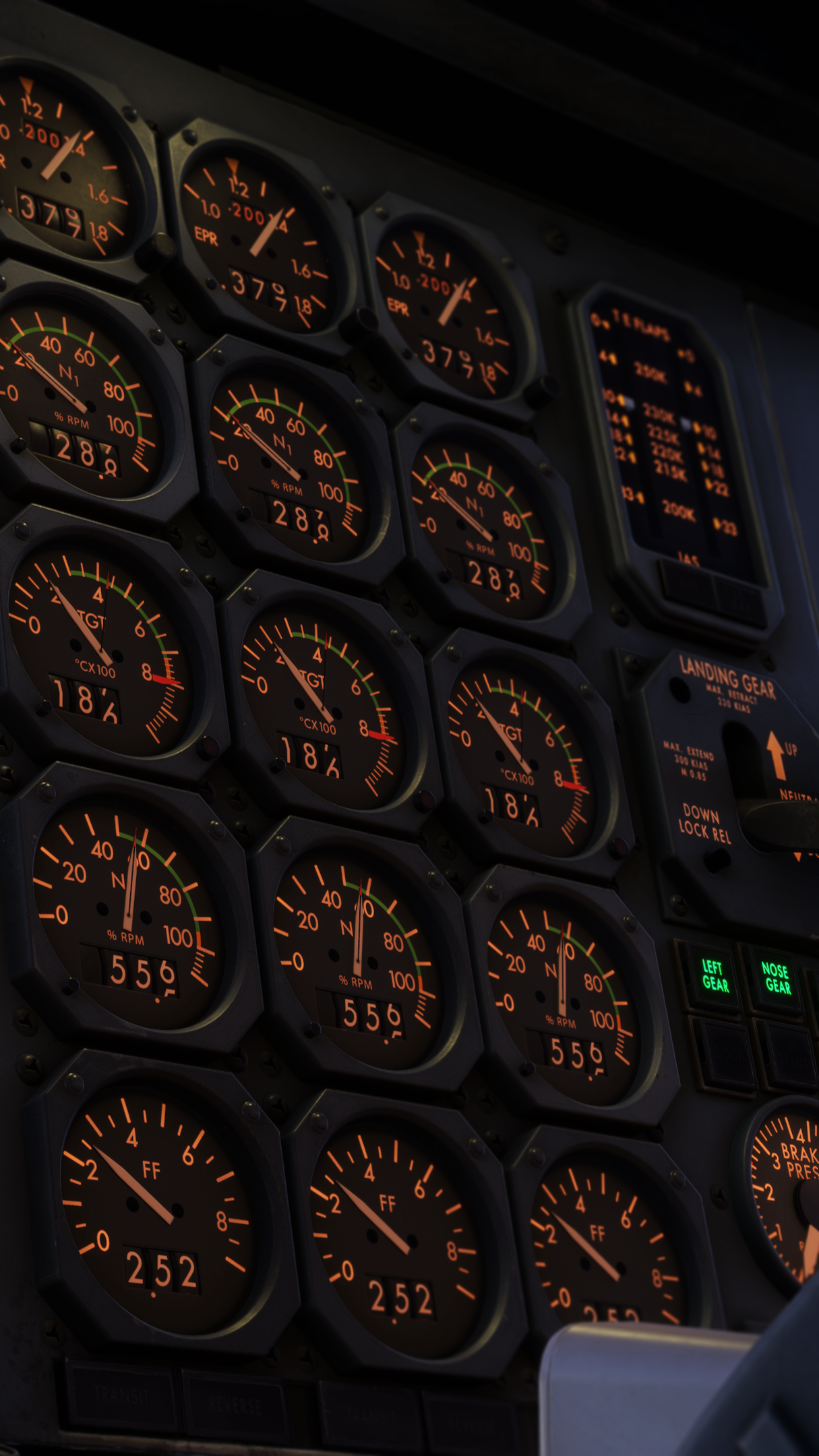 - Fully dynamic cockpit lighting suite, including panel, flood, pedestal, and Flight Engineer station lighting.