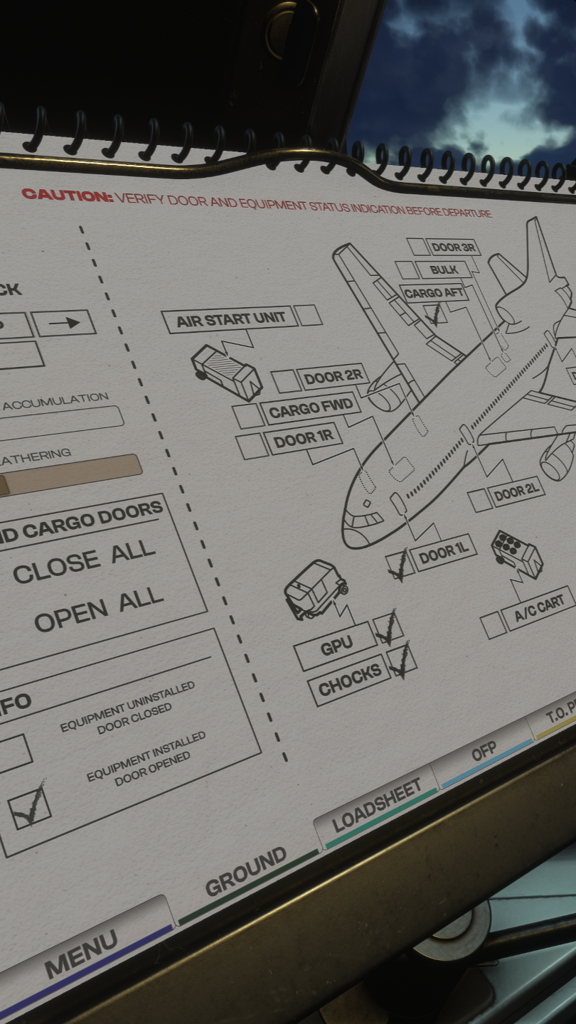 - Aircraft ground services and state control panel (doors, GPU, air start, pushback).