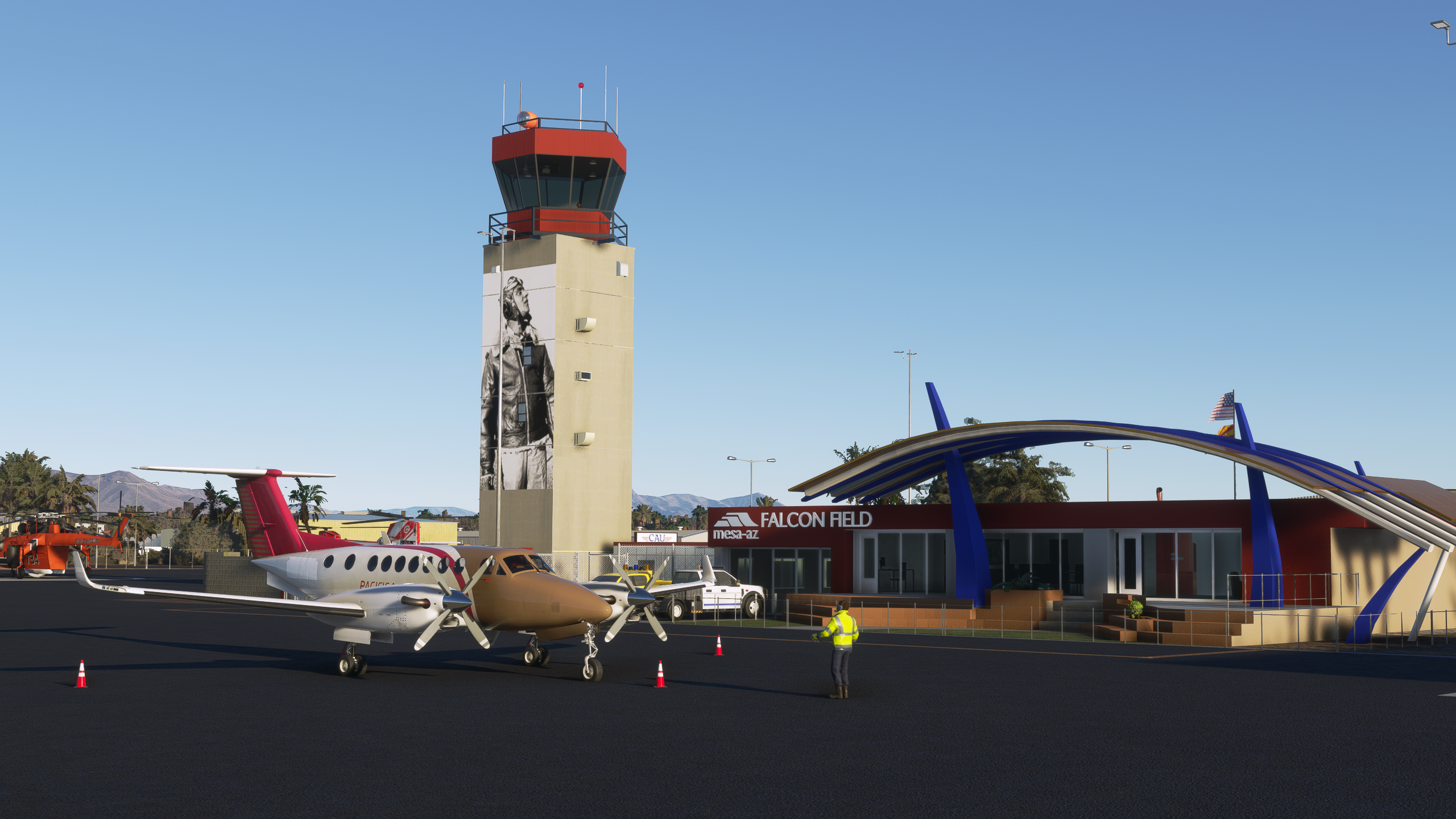 Falcon Field Airport (IATA:MSC, ICAO: KFFZ), Located in the City of Mesa, AZ about 20 miles east of Phoenix and is one of the busiest General Aviation airfields in the USA in terms of movements. Falcon Field includes a total of 784 acres, there are currently more than 800 aircraft based at the airfield. This includes fixed-wing single- and multi-engine aircraft, turboprops, jets and helicopters. It is a perfect starting location for a flight to Sedona, or the Grand Canyon, and also very close to Apache Junction where the Apache Trail leads you to the Superstition Mountains.
