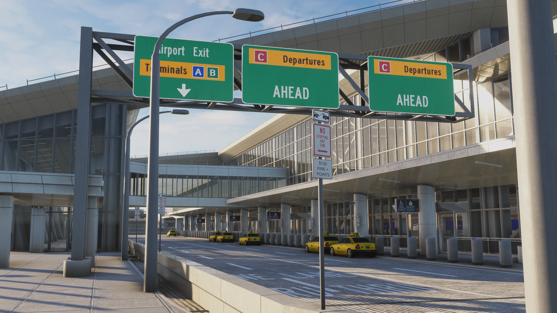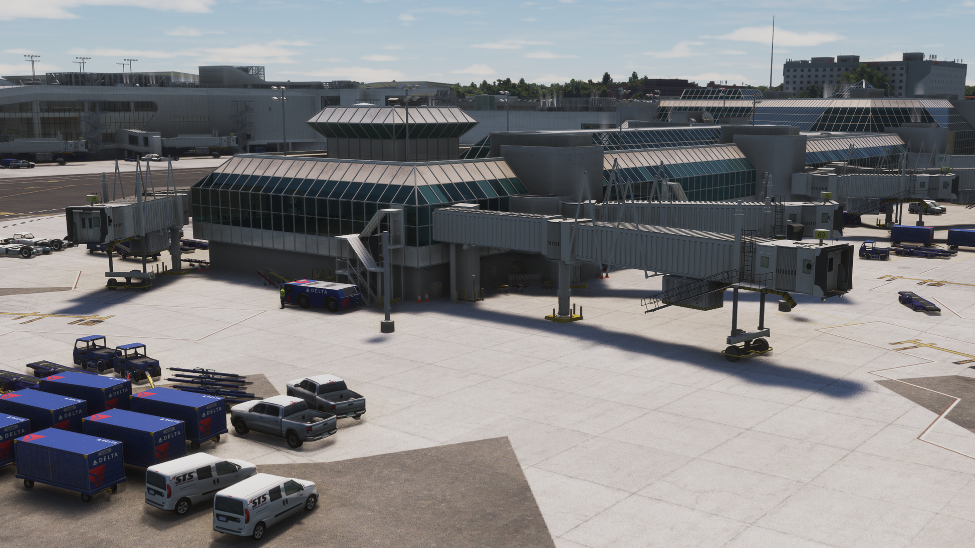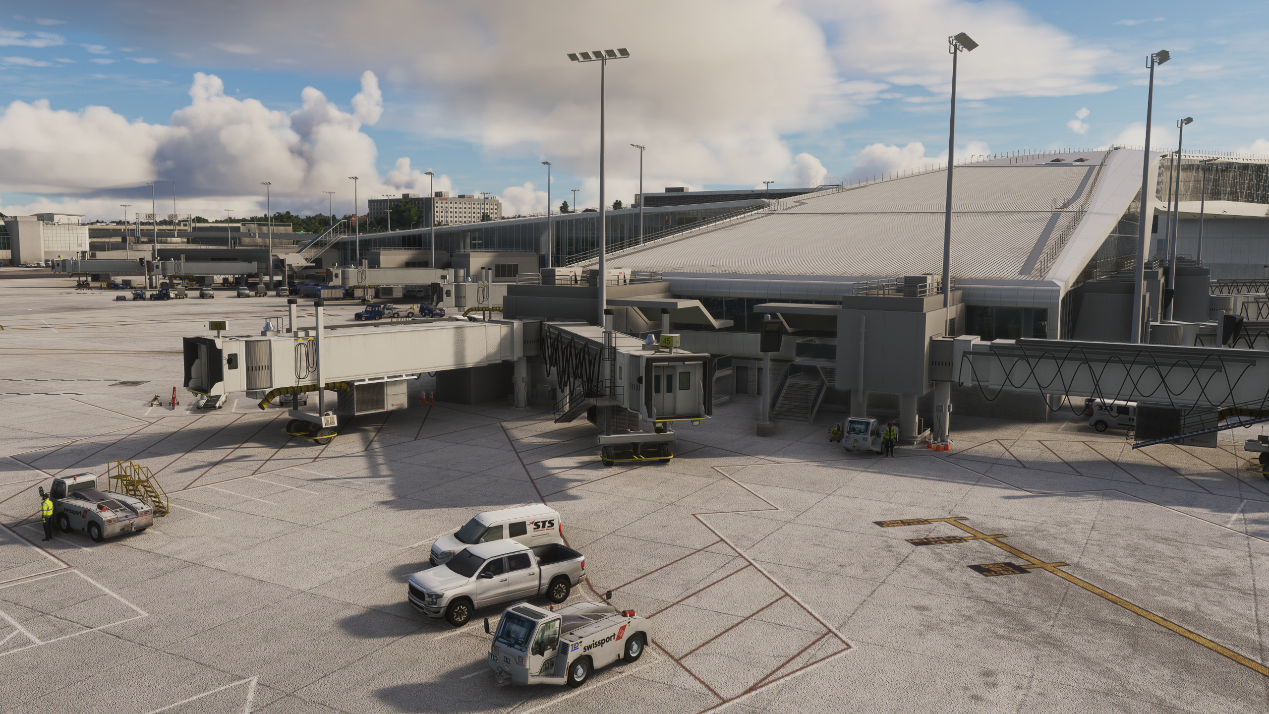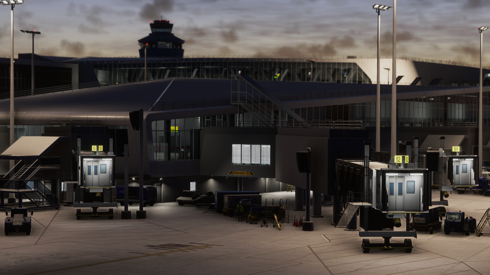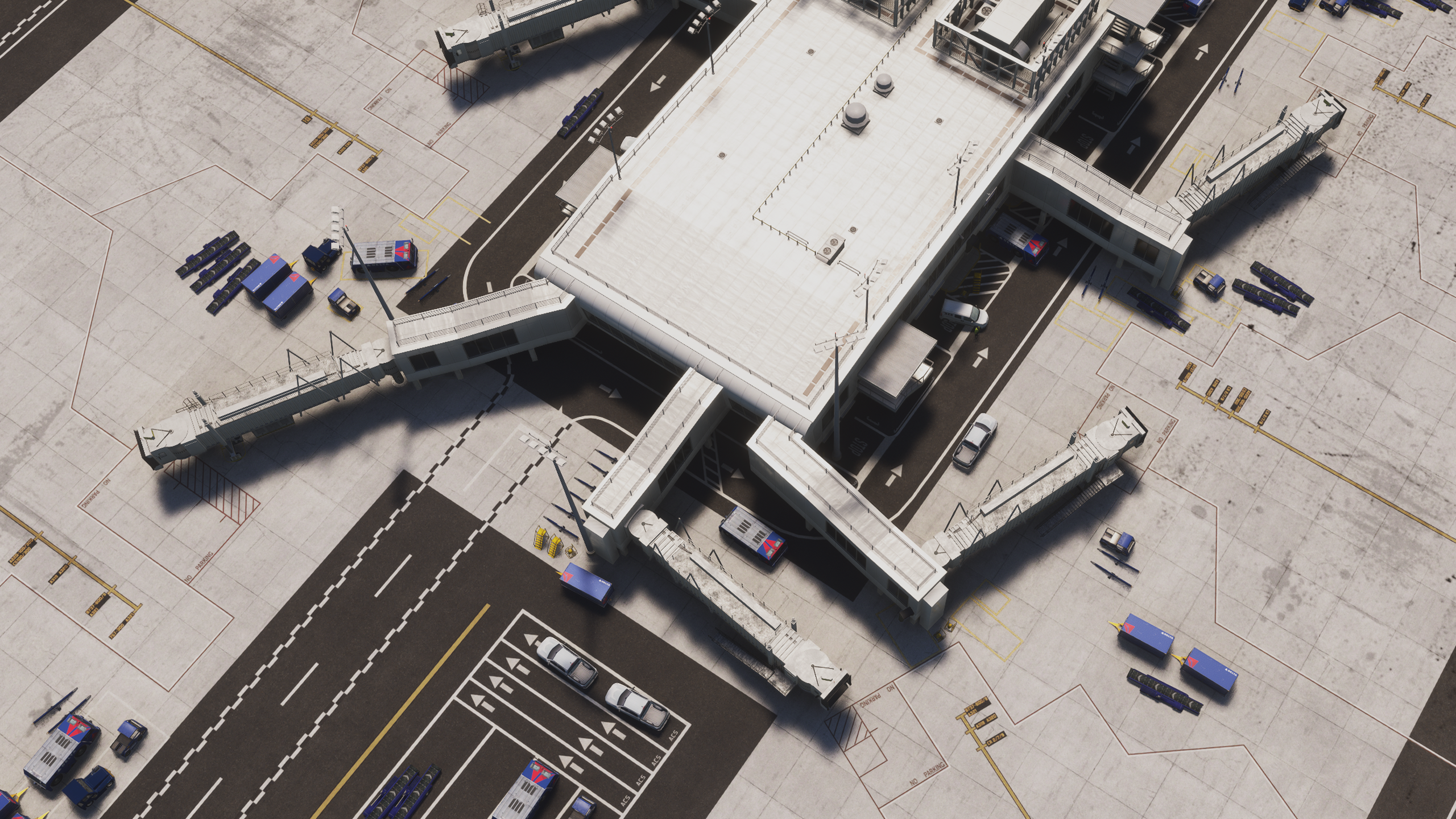 - Handcrafted 3D models of buildings, jetways, and various airport facilities