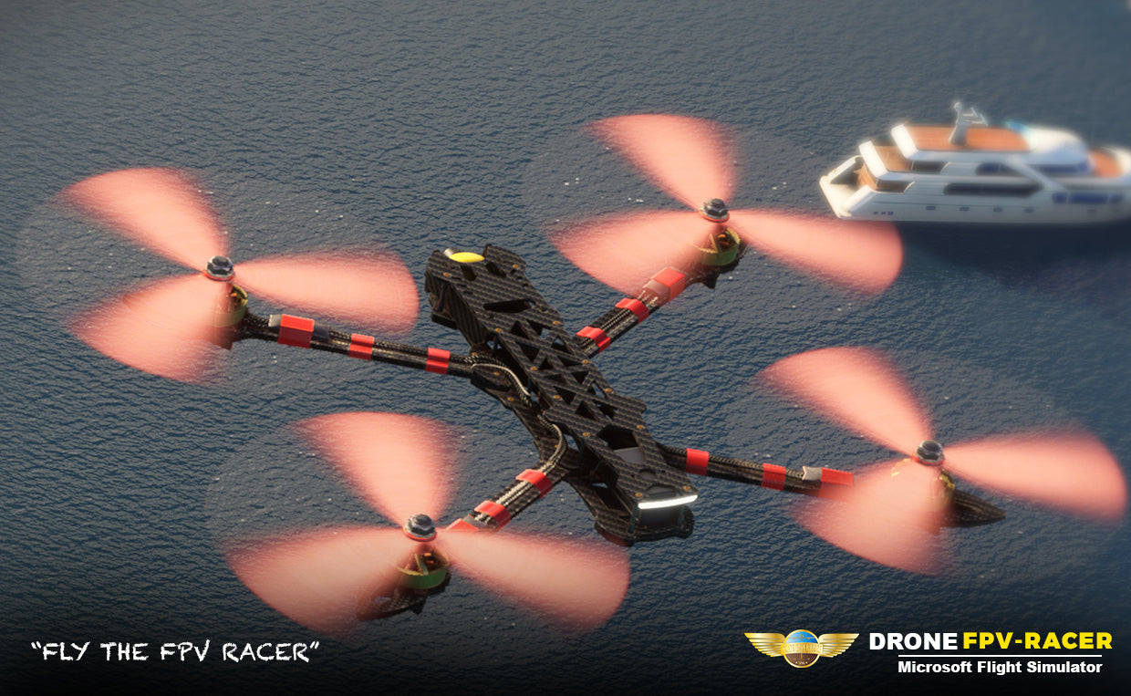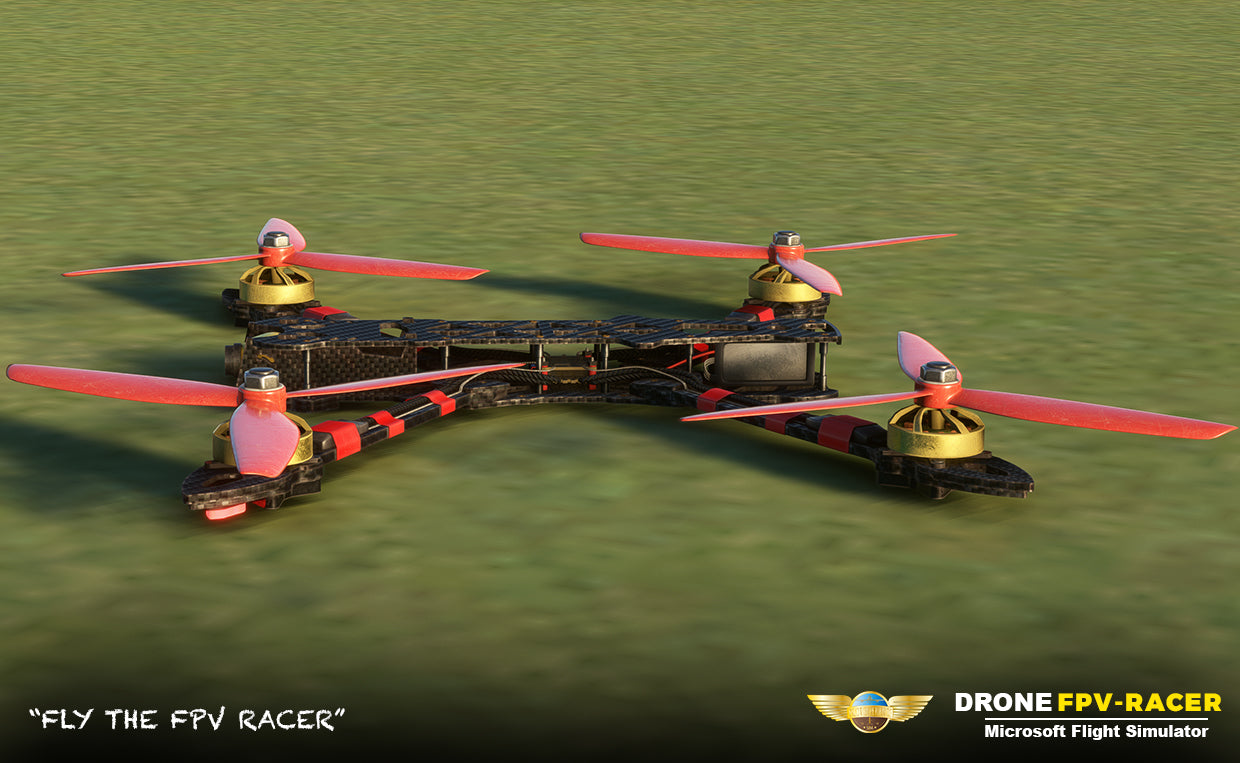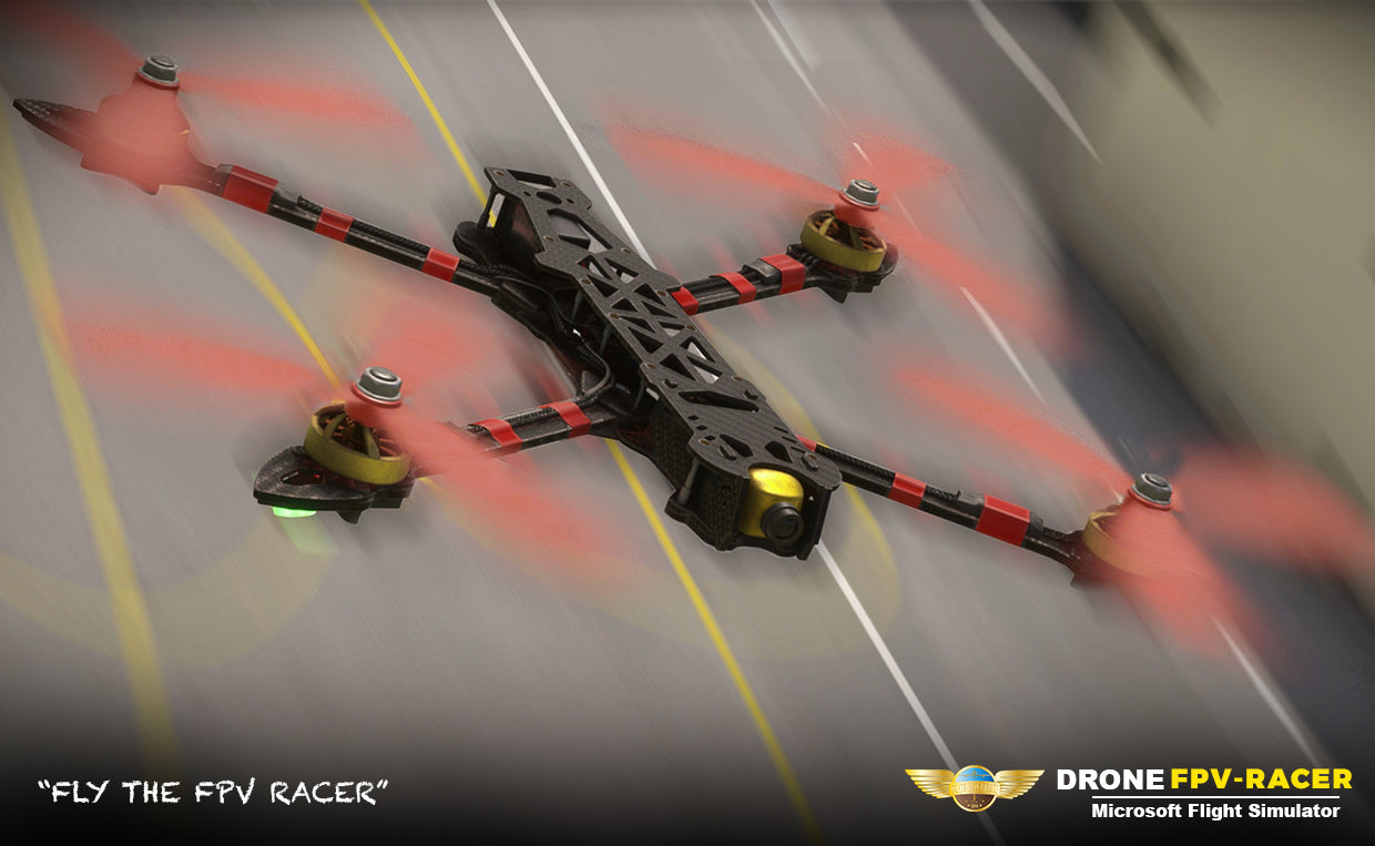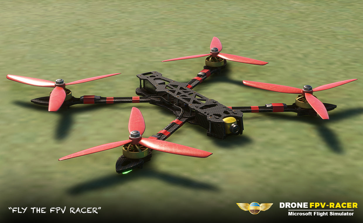 Pilot Experience Sim presents the Drone FPV racer. The flight model is custom coded and it represents a racing drone in kit form for assembly. The elements are made of carbon and include a lipo battery and the sounds come from a real drone.