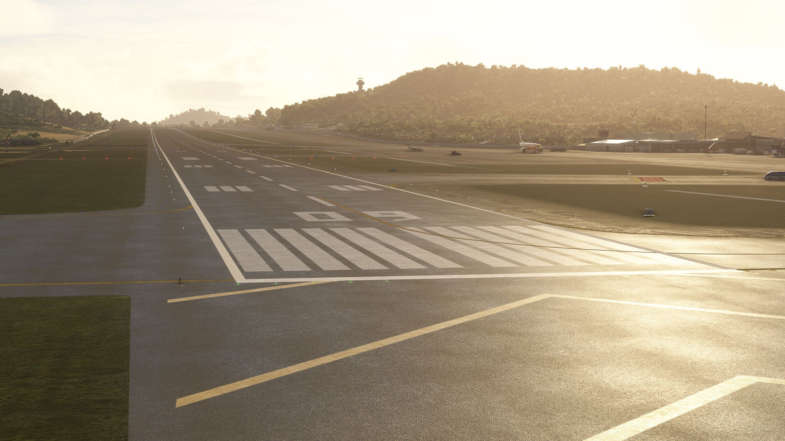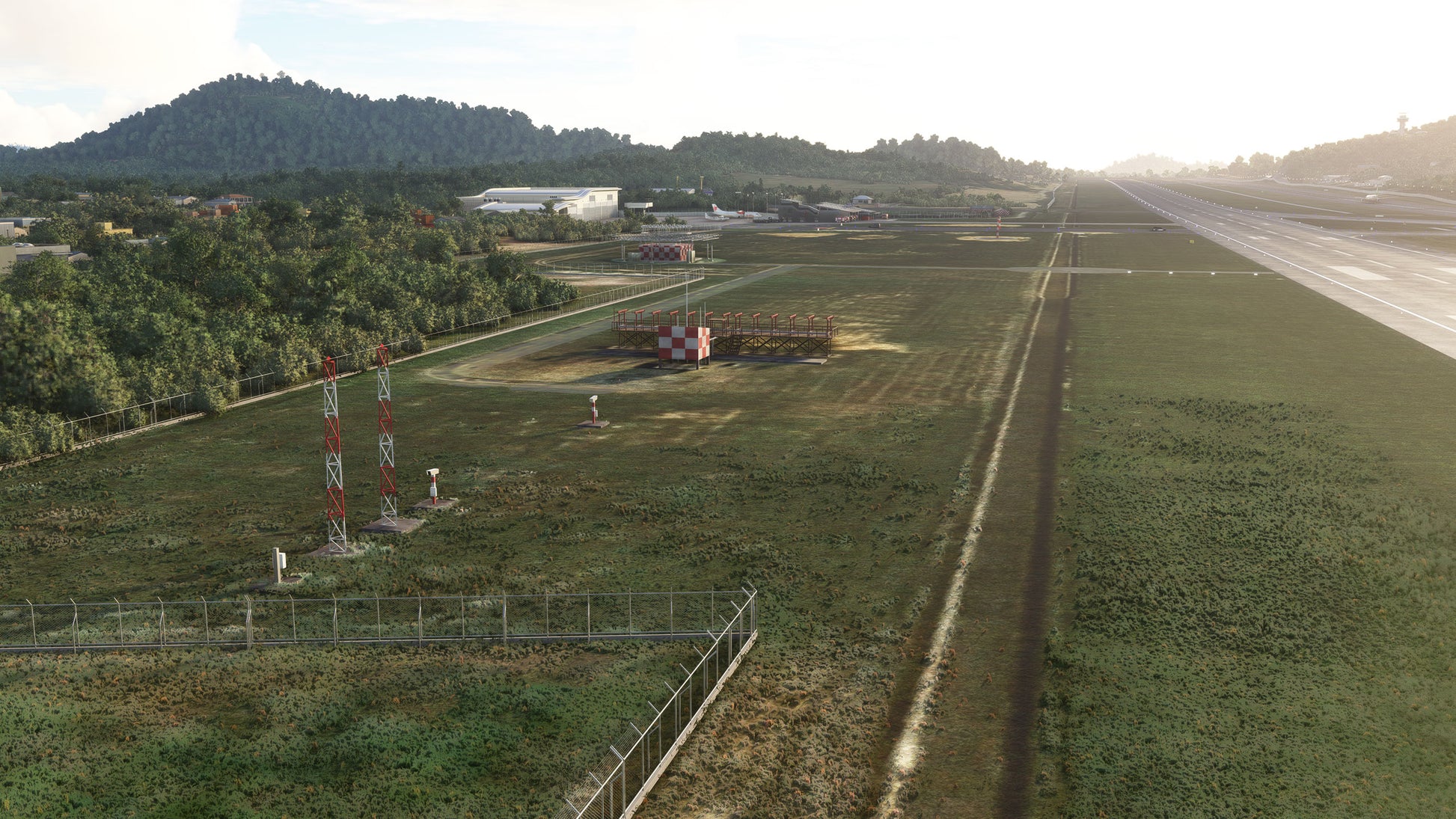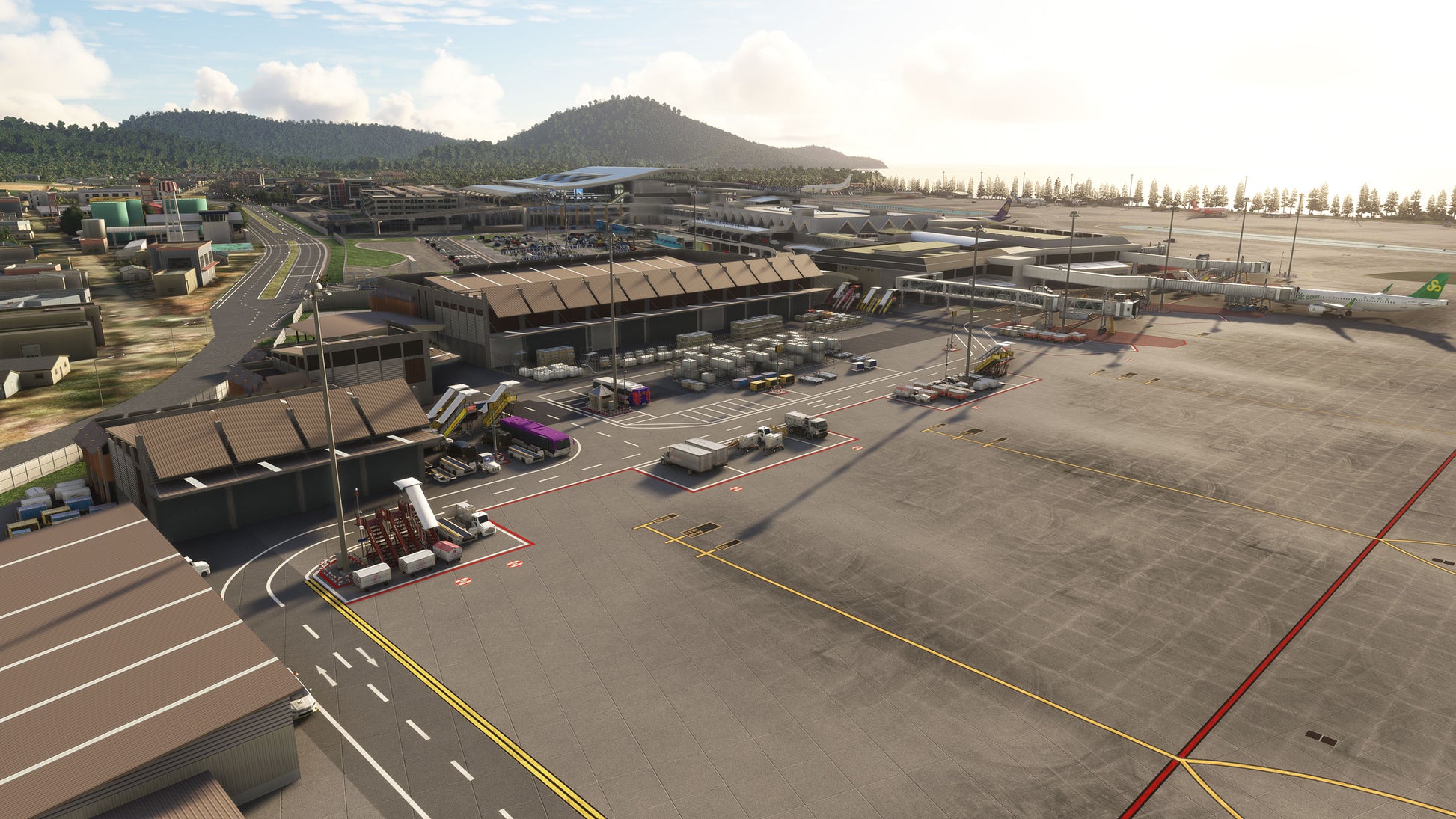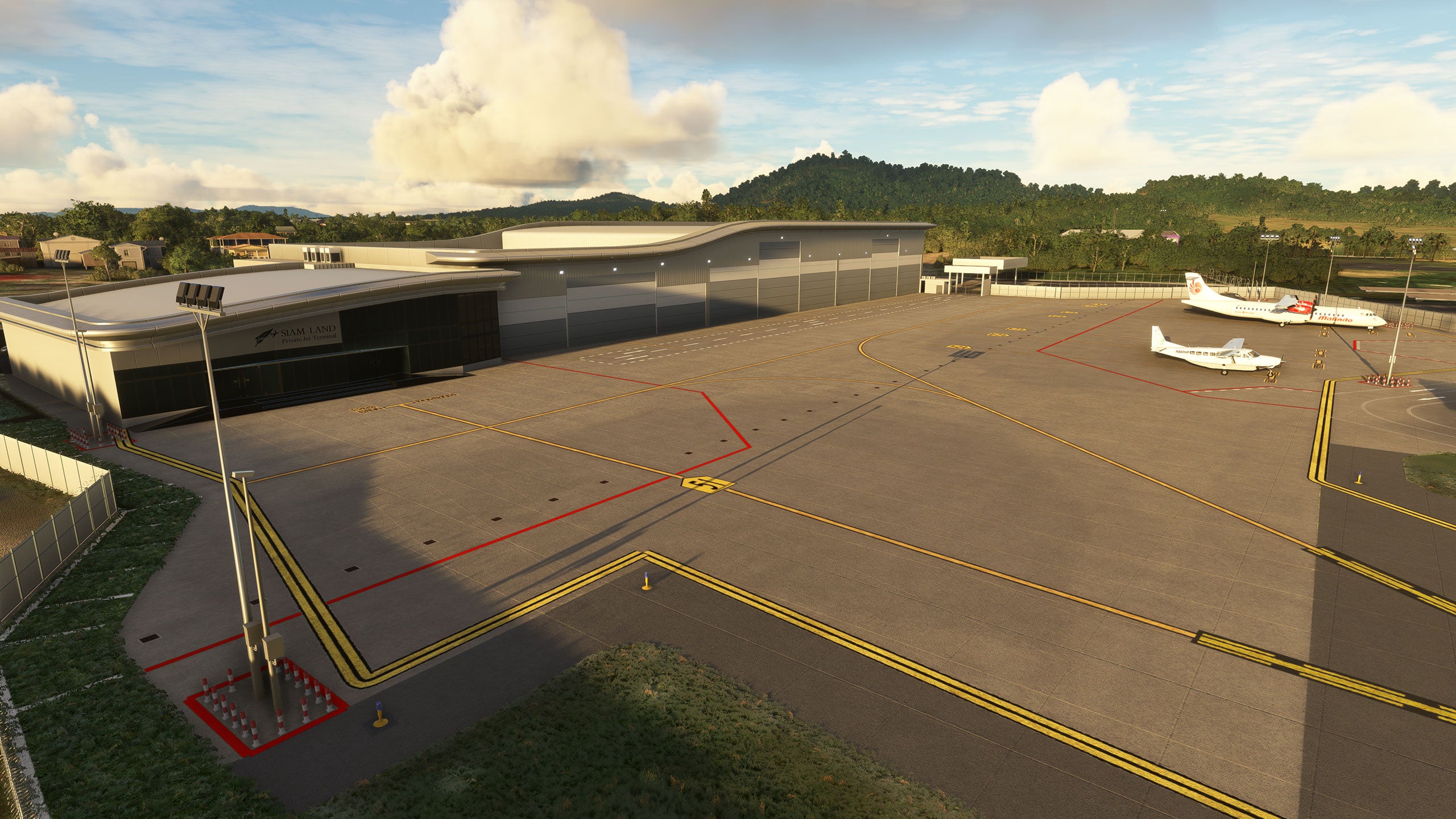 - Custom ground texture, and static objects around the airport