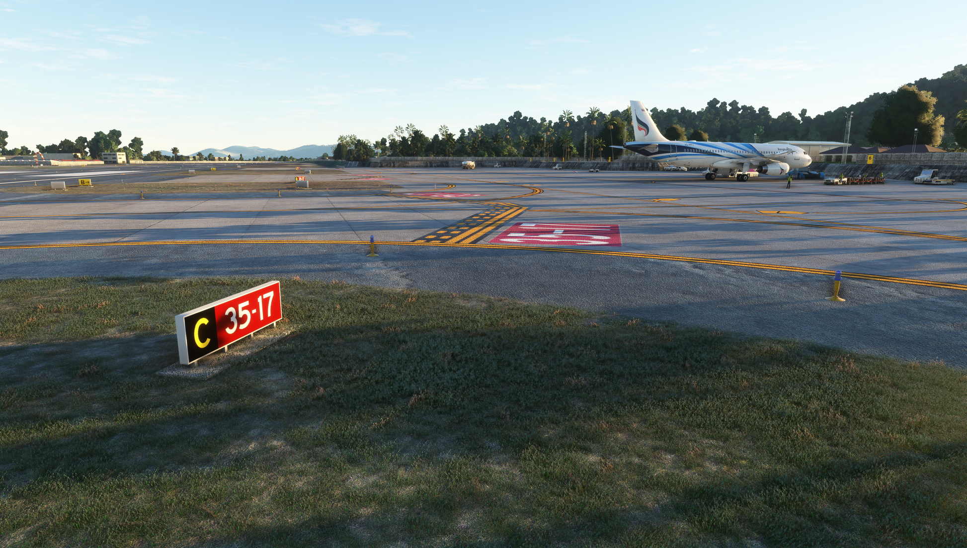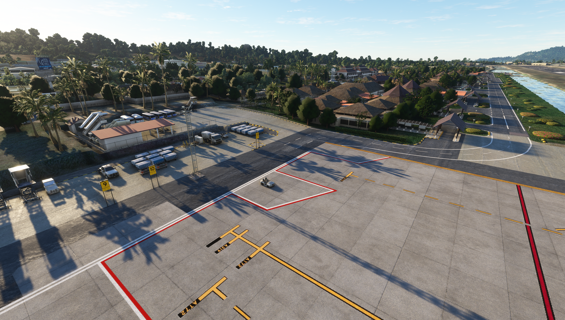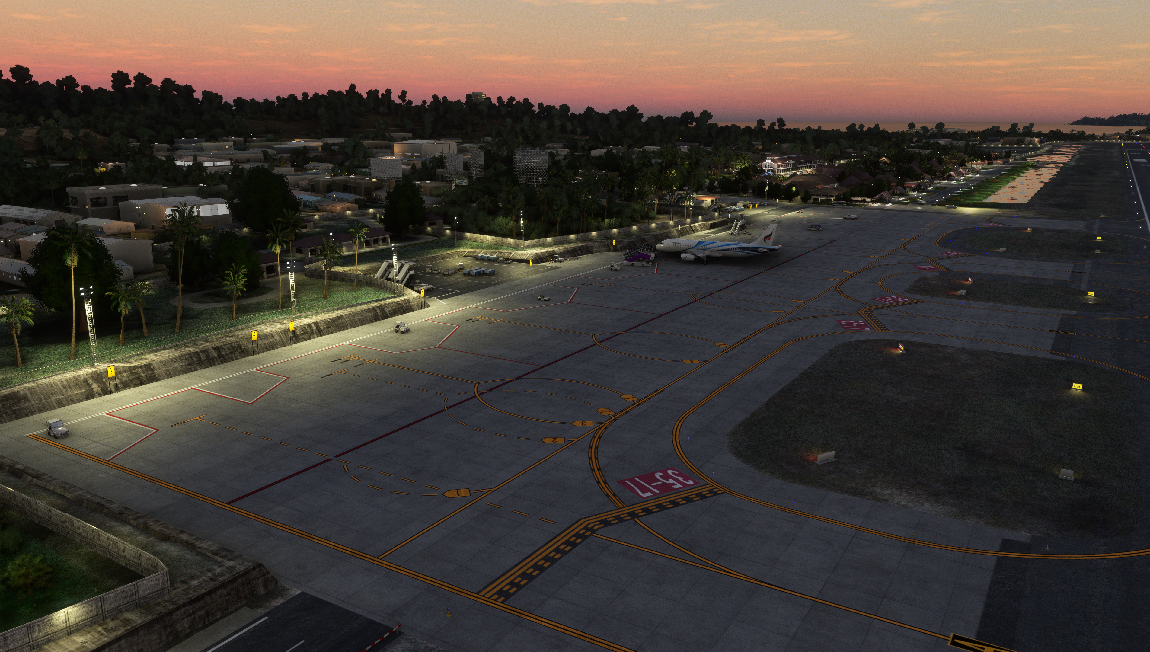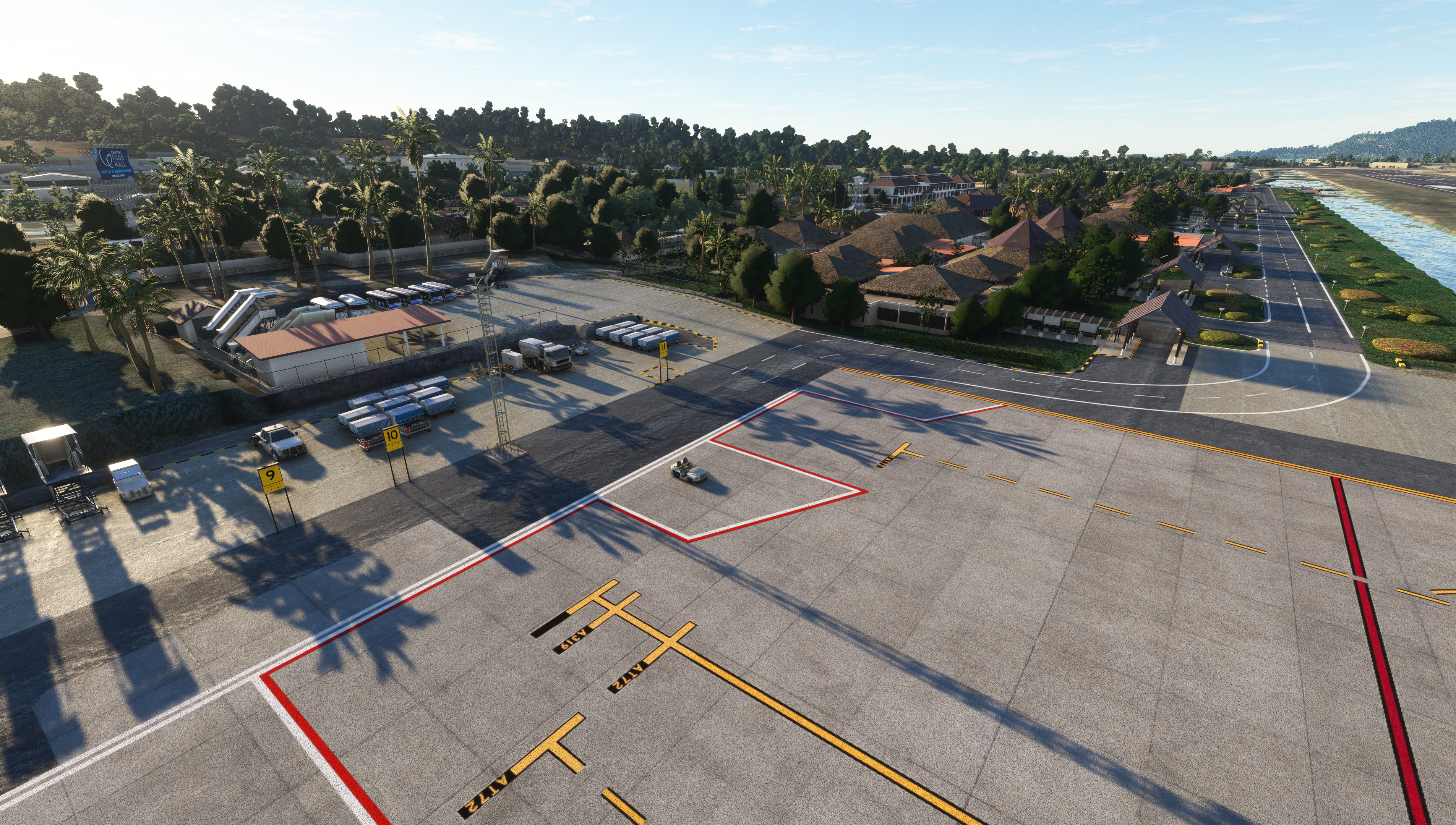 - Custom ground texture. Static objects around the airport