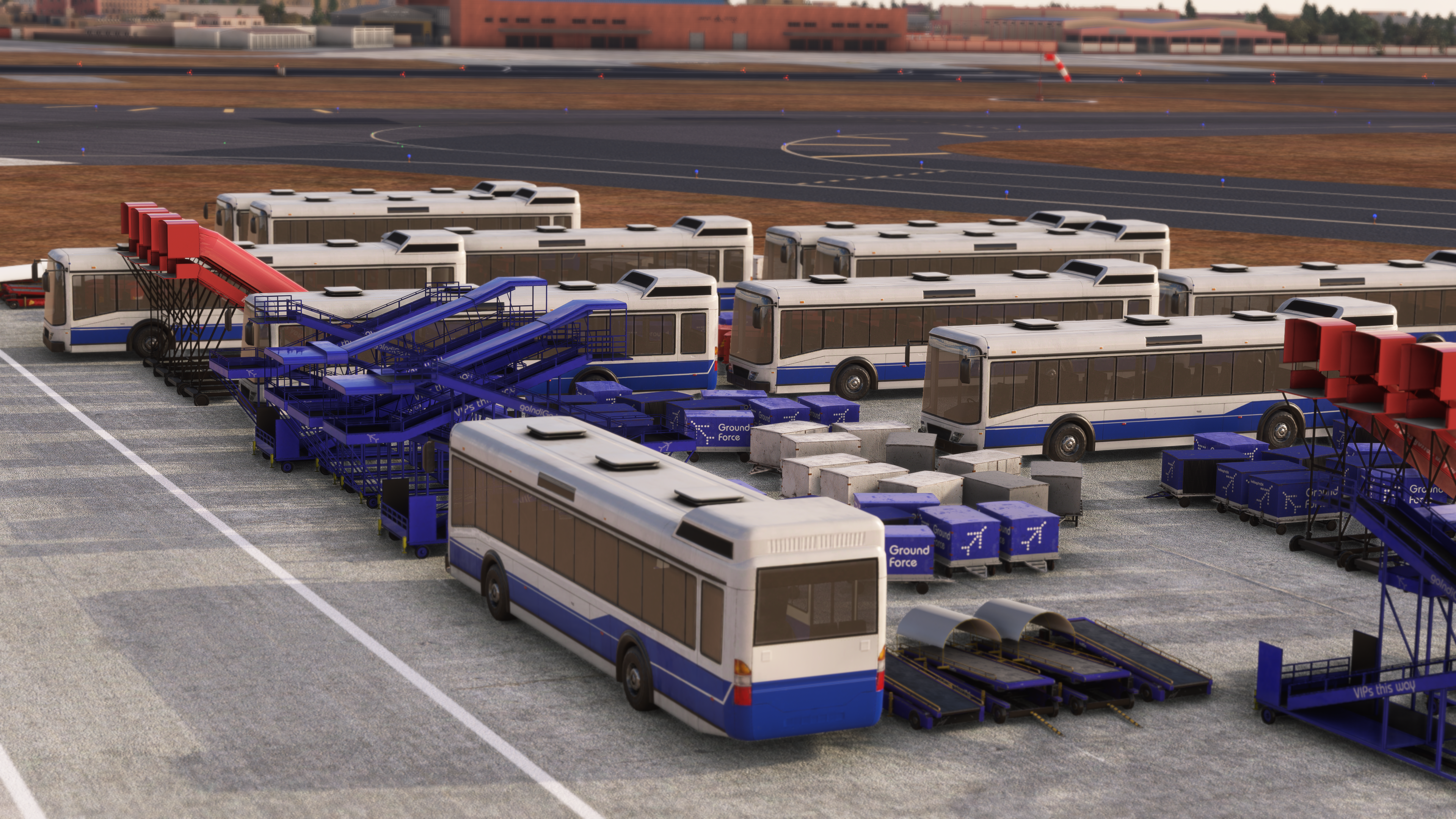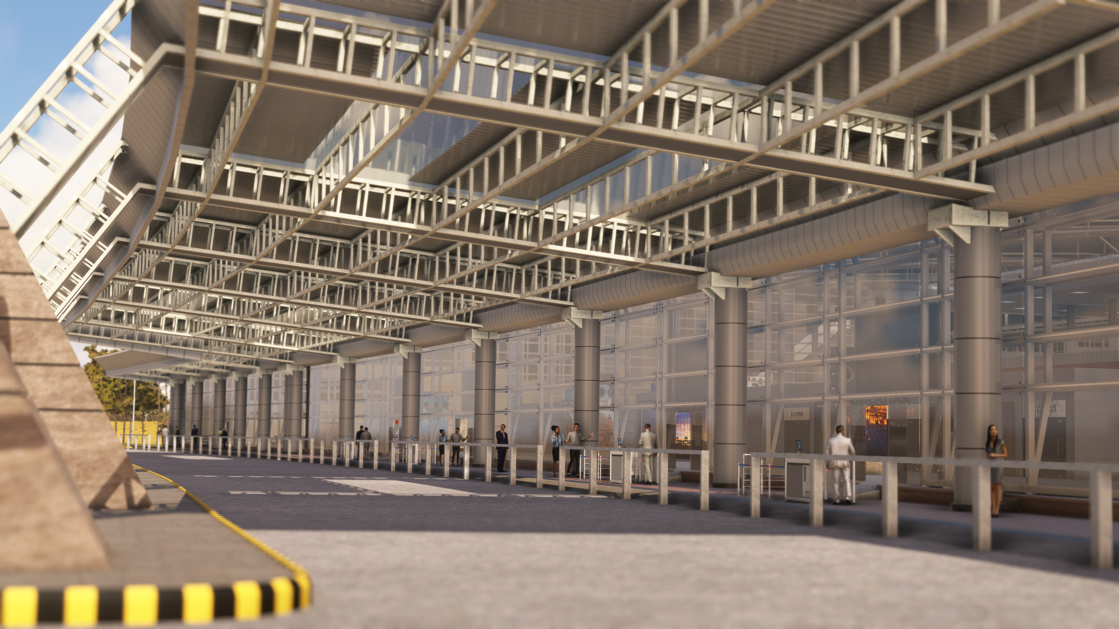 - The landside area has been thoughtfully recreated with local signage, vegetation, barriers, and details that bring the terminal surroundings to life