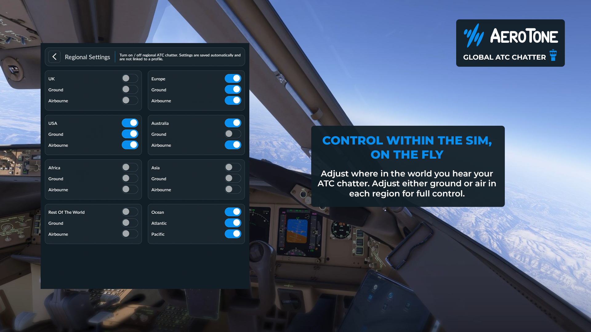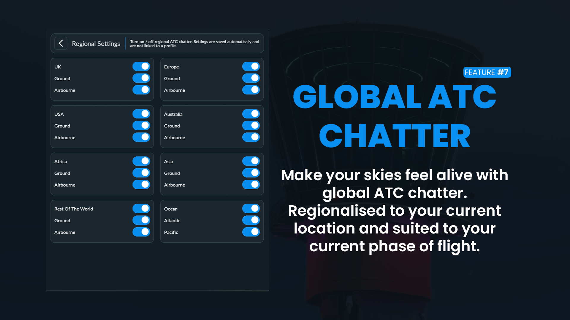 - Regionalised ATC Chatter Over 100 hours of recorded ATC chatter that adapts based on location and whether you are taxiing or airborne.