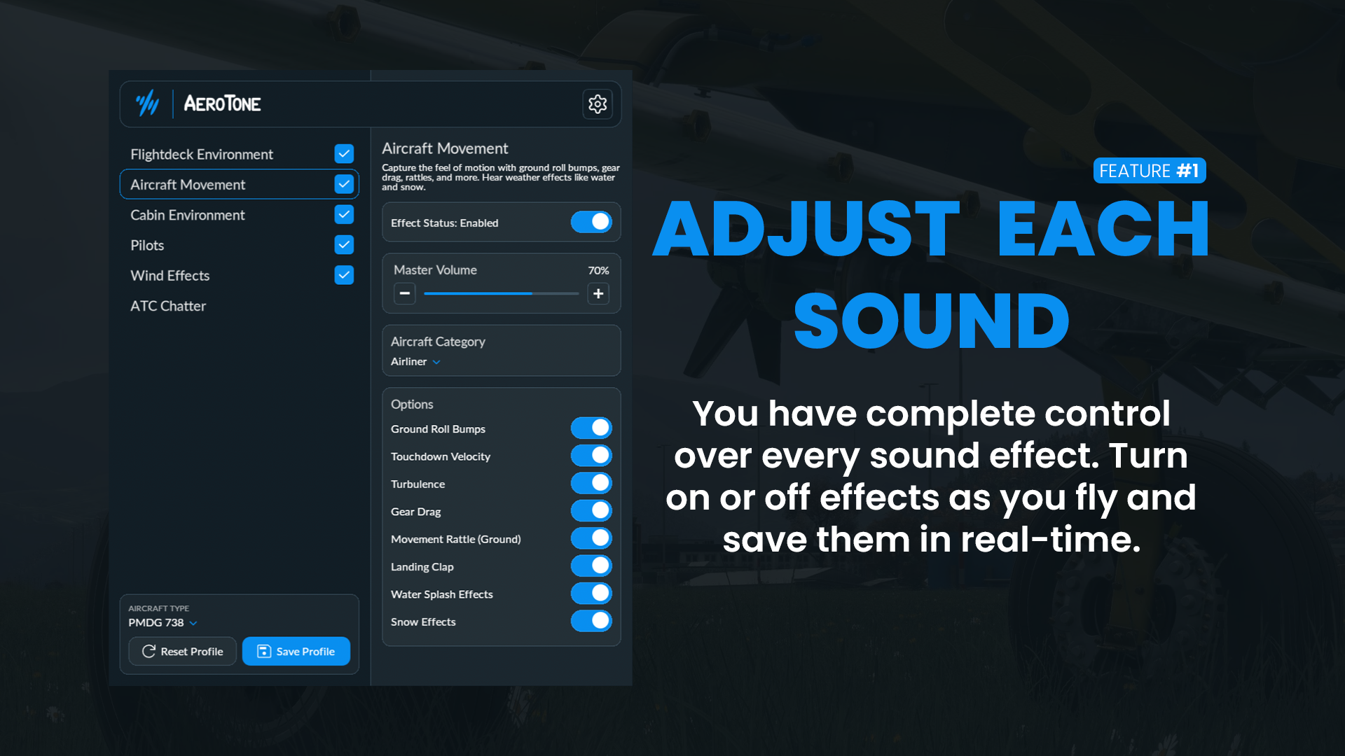 Experience authentic sound design built from hundreds of professionally produced recordings that cover a wide range of aircraft types and flight conditions. AeroTone adds depth and detail to engines, wind layers, avionics, airframe movement, environmental effects, and more, creating a multi-layered acoustic experience throughout every phase of flight.