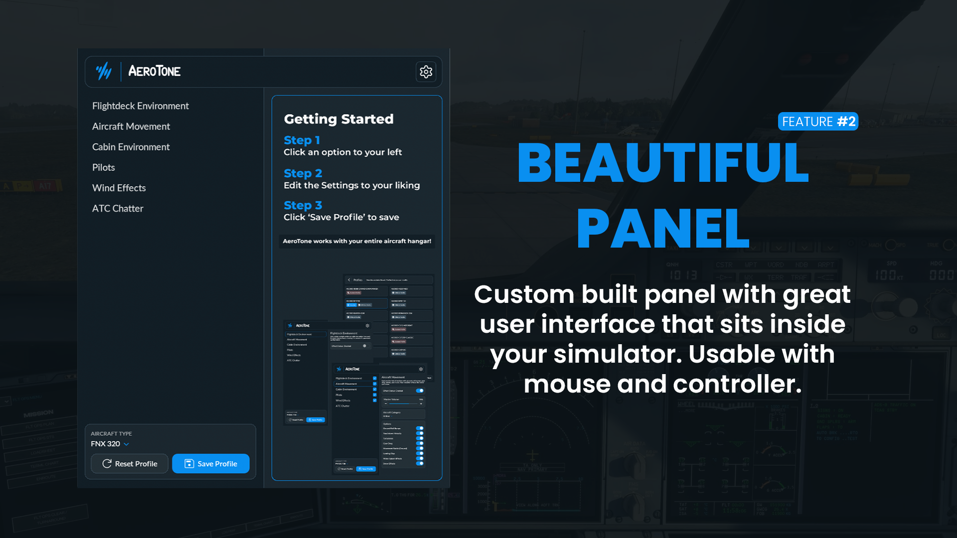 - Custom In-Sim Audio Panel Adjust sound levels, presets, and balance while you fly — no third-party tools necessary.