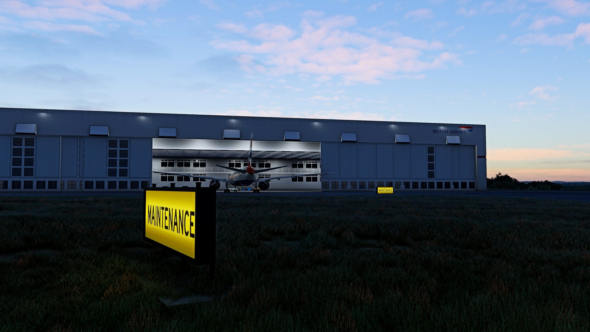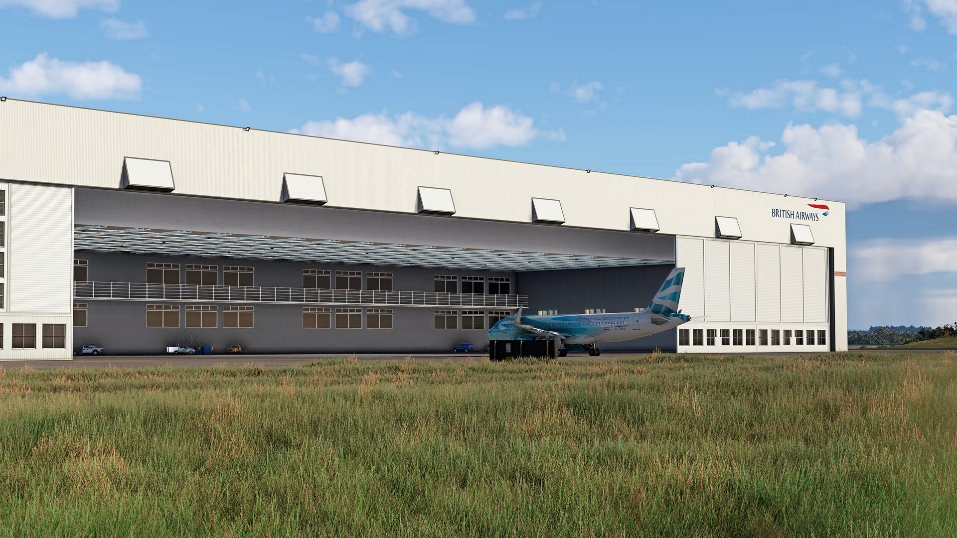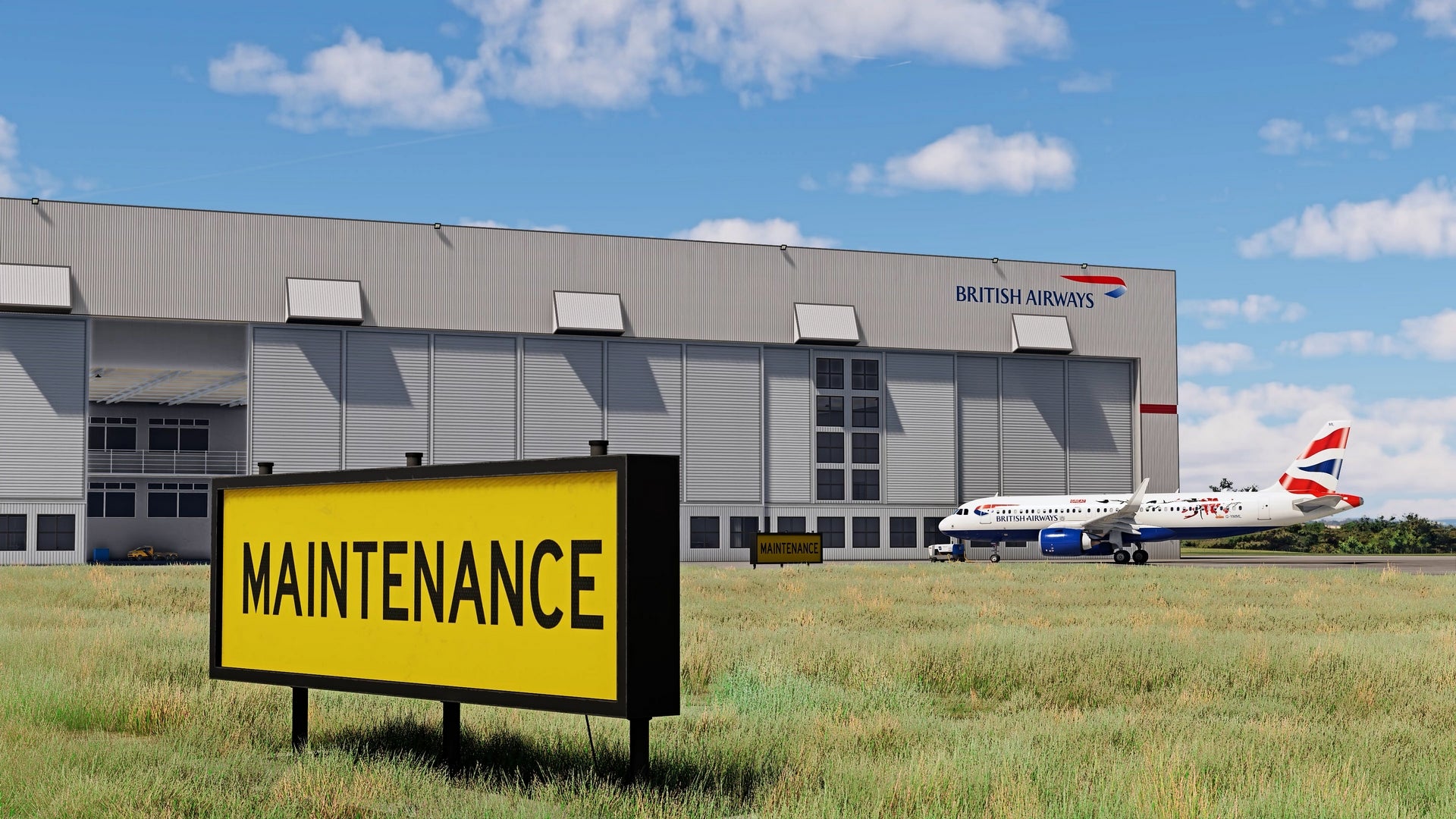 - Animated British Airways maintenance hangar with operational doors from 6:00 AM to 6:00 PM